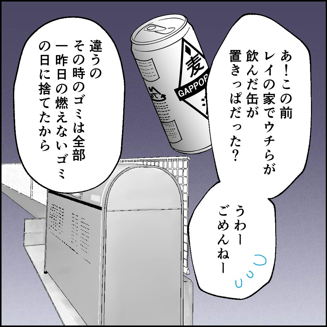 そもそもレイは、お酒が飲めません。友達が来たときのを片付け忘れたのか?とも考えますが、そのときのゴミは一昨日にまとめて捨てているそうです。