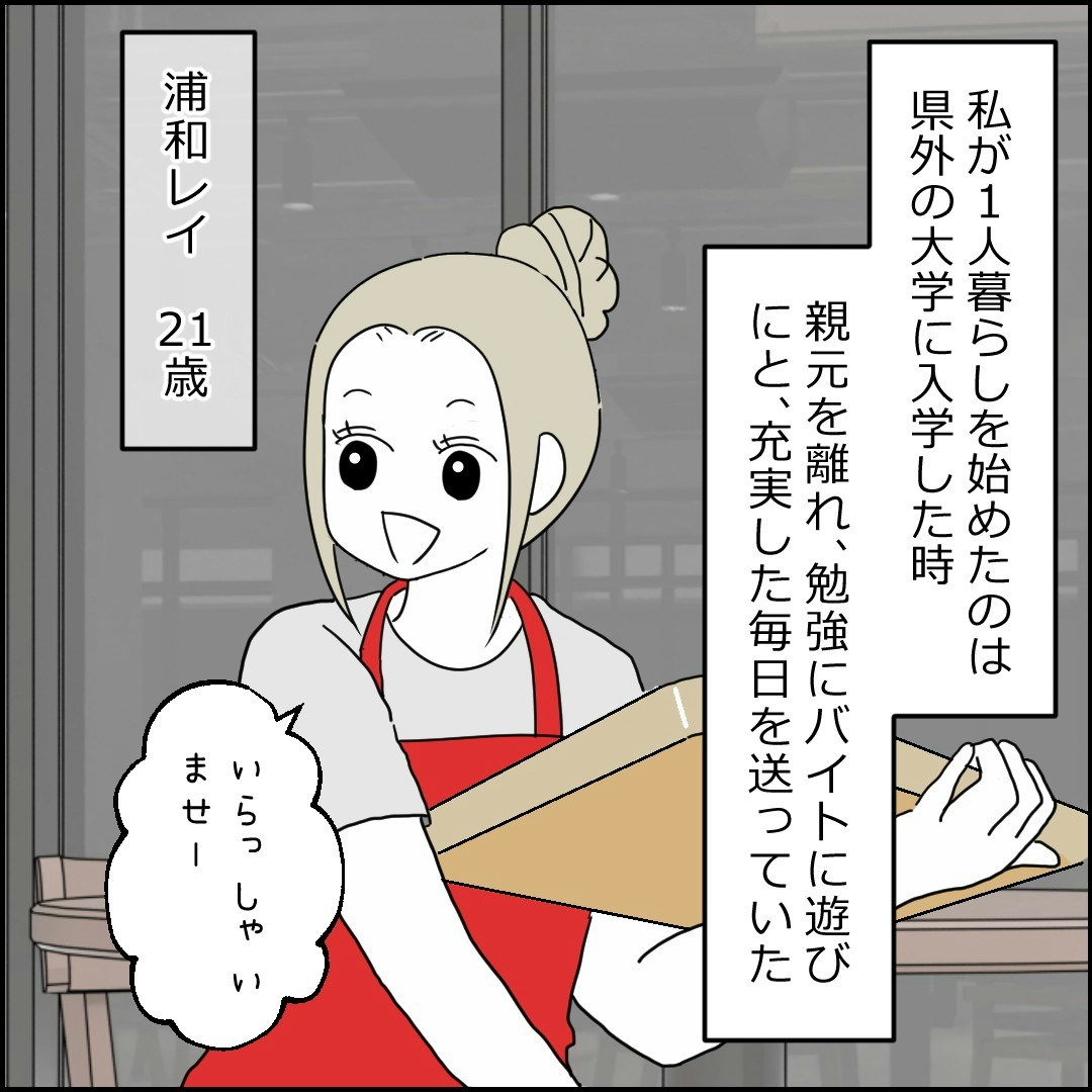 親元を離れ、県外の大学に通う21歳の女子大生・レイ。一人暮らしをしながら勉強、遊び、アルバイトと充実した日々を送っています。