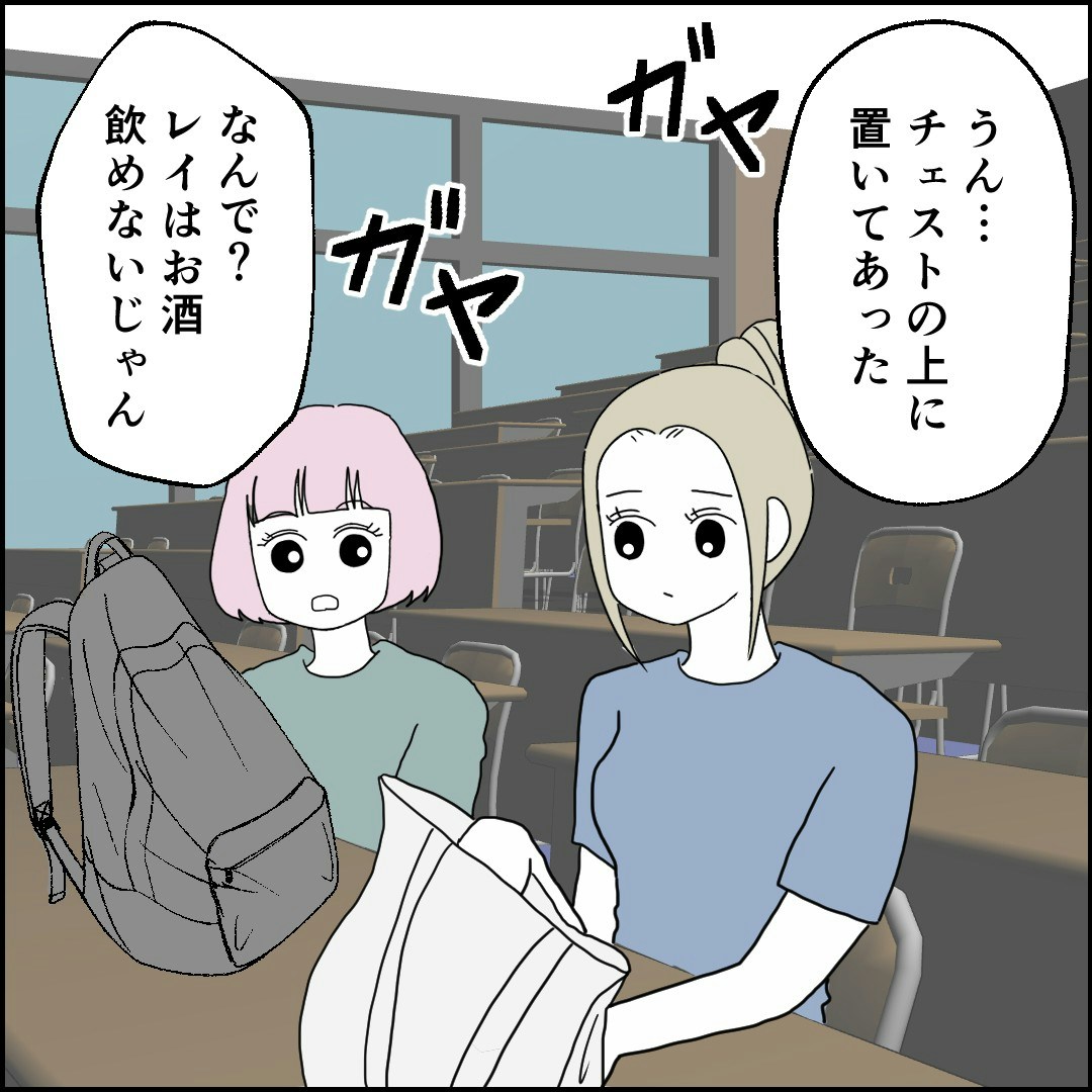「おかしい」と感じたのは、ビールの空き缶。レイ自身、身に覚えがなかったのです。不安になったレイは、大学の友達に話してみることにしました。