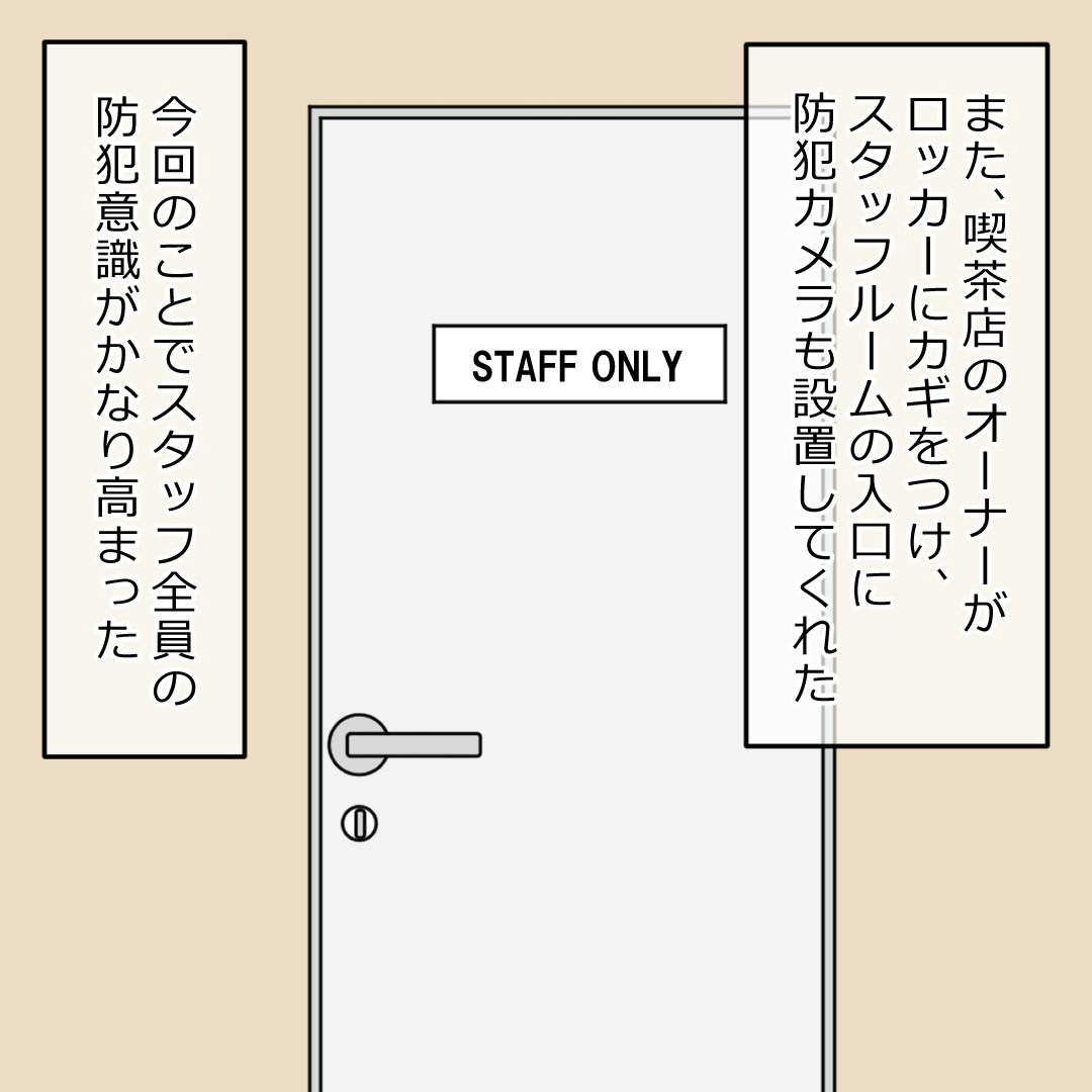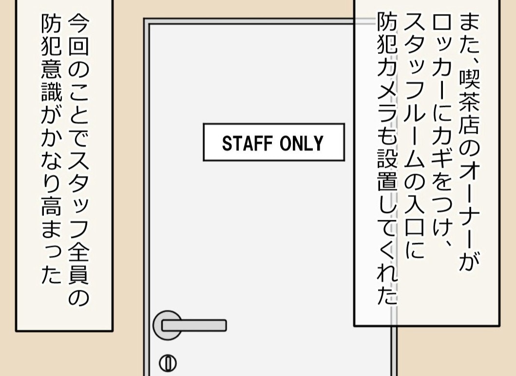 事件を受け、バイト先の喫茶店ではロッカーの鍵や防犯カメラを設置し、スタッフが安心して働けるような環境づくりに努めてくれています。個人での防犯意識も高まったそうです。