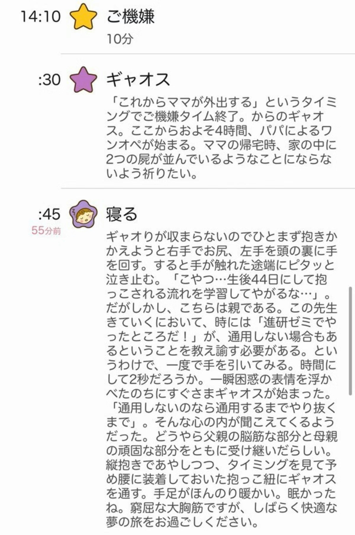 何が起こったか、どう対処したか、パパさんの心情までも細かく書かれており、とても読みごたえがありますね。さらには言葉選びも絶妙で不思議と続きが気になってしまいます。ワンオペで大変な中で「ギャオス」「窮屈な大胸筋ですが、しばらく快適な夢の旅をお過ごしください」といった、ユーモアあふれる言葉で気持ちが和らぎます。