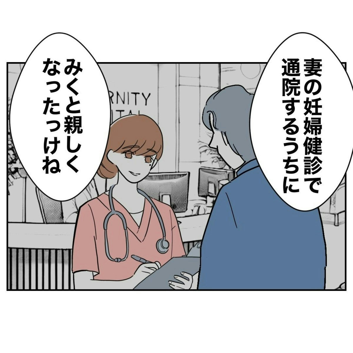 まいの夫がまいや娘を置いて逢瀬を重ねていたのは、なんとまいの出産時に担当をしてくれた助産師・みくでした。驚くべきことは2人の関係はすでに1年も続いているということ…。