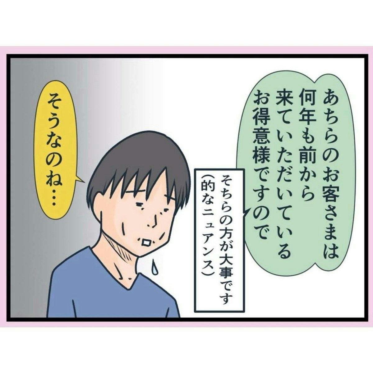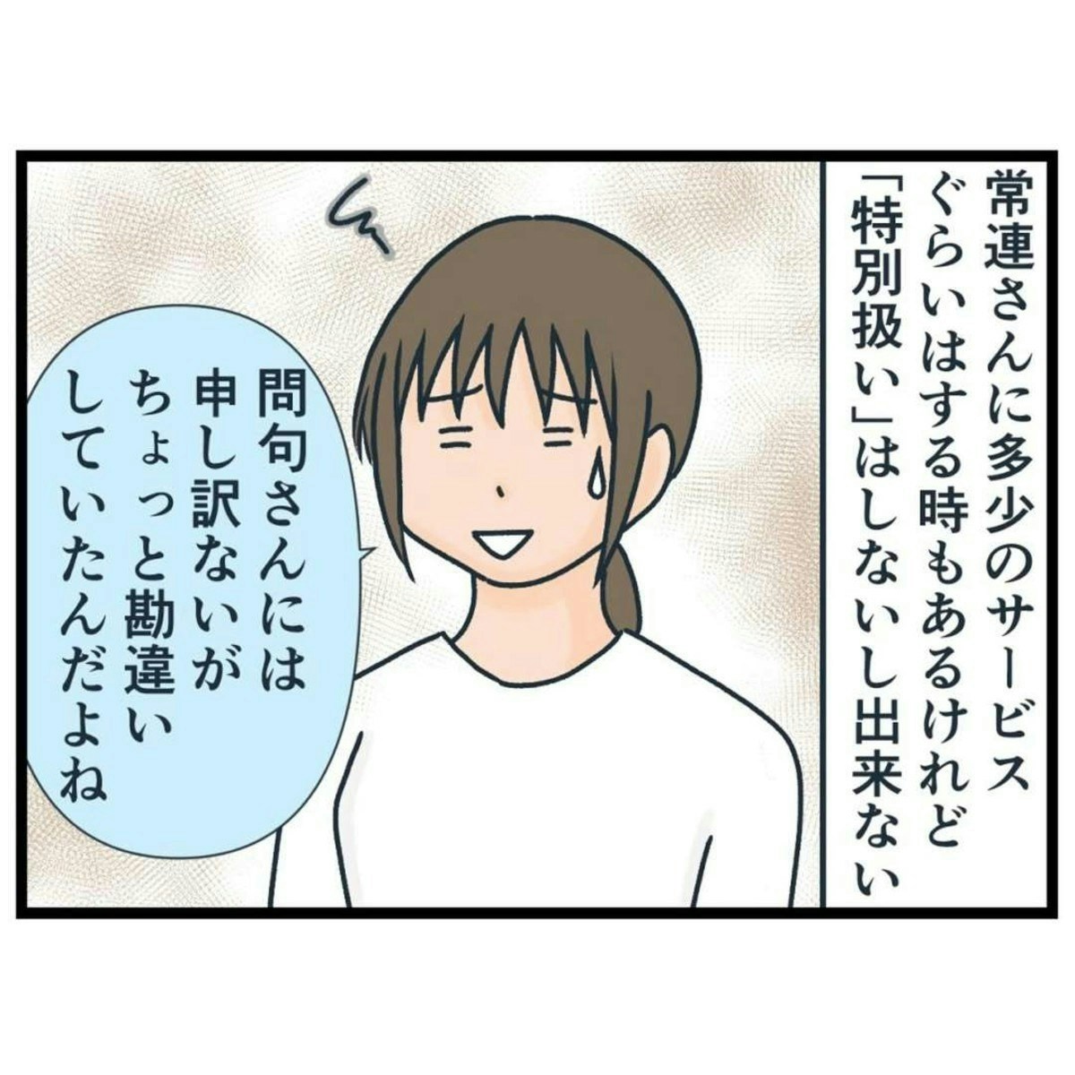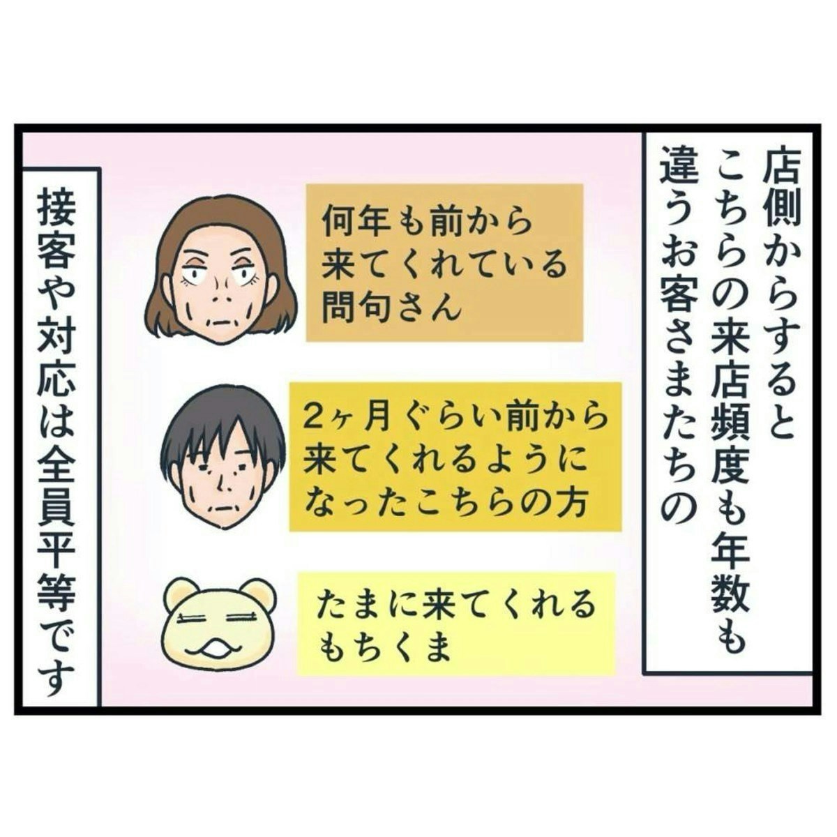 問句さんにとって「気に入らない新規客」も、ナエくまさんをはじめ他のスタッフから見れば「普通のお客さん」なので、店員としてみるとどうすることもできません。問句さんは「自分が常連だから特別扱いをしてほしい」という気持ちが大きい人なのでしょうね…。