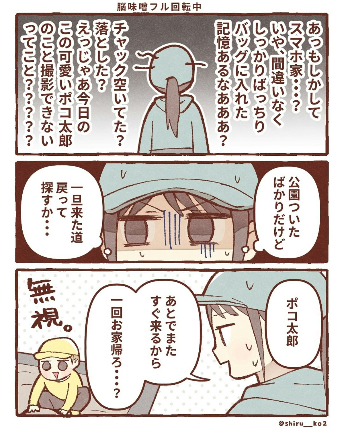 スマホを落としたことに気づき、あせる しる子さん。ポコ太郎くんに「一度、家に帰ろう」と話してみたものの、ムシされ、しばらく遊びに付き合うことに。そして、40分後、来た道を戻り、スマホを探しますが…。