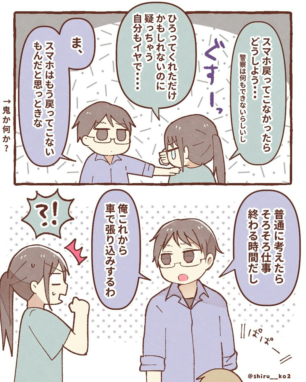 しる子さんのスマホを探すべく、夫は駐車場で張り込みをすることに。「スマホは返ってこないもの」と言う夫に、へこむ しる子さん。そして、18時になっても連絡はありません。スマホの位置情報も変わることはなく…。
