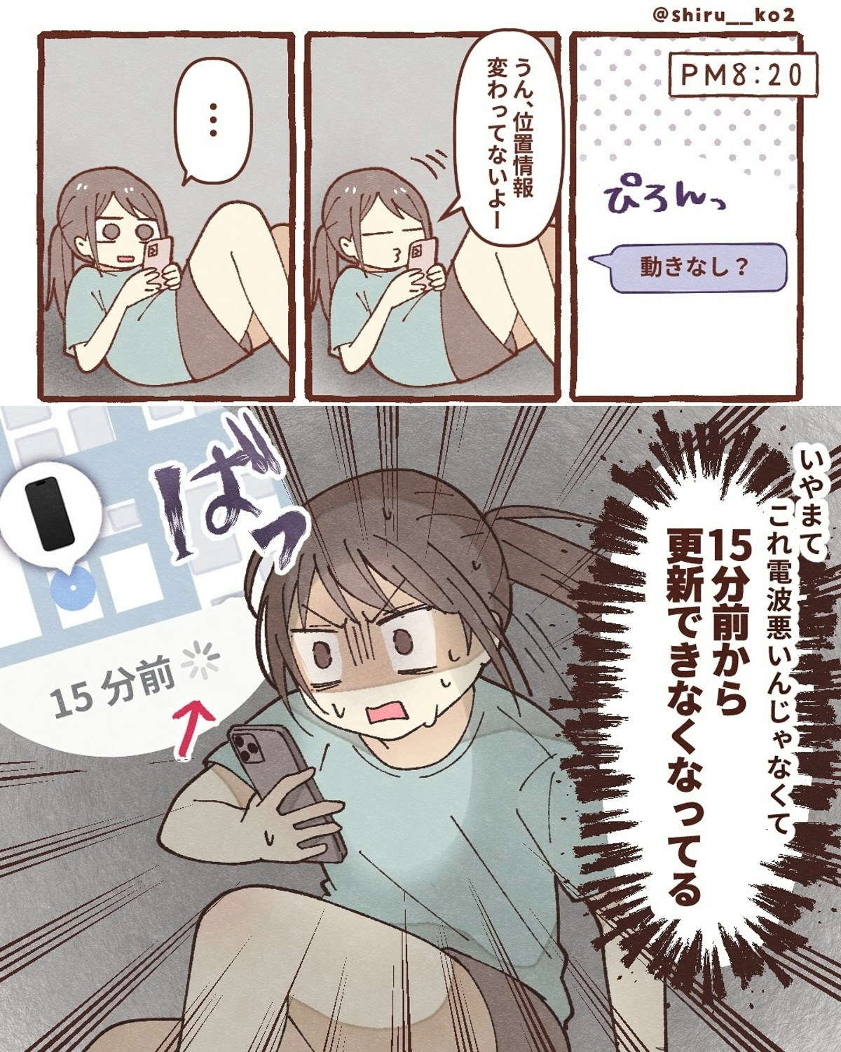 15分前から、スマホの現在地を更新できなくなっていたことに気づき、あせる しる子さん。電波が悪いわけではなさそうなので、考えられるとすれば、電源を切られた可能性です。