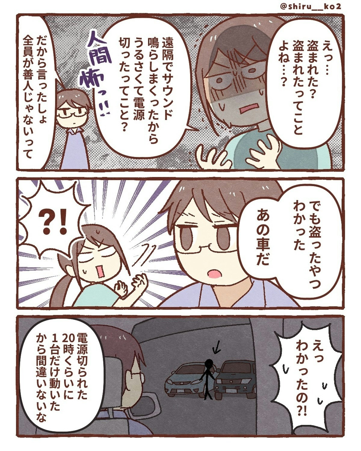 スマホを拾った相手に、携帯の電源を切られたことに気づいた しる子さん。見張りをしていた夫は、犯人の車がわかったようです。そして、ある作戦を思いつき…。