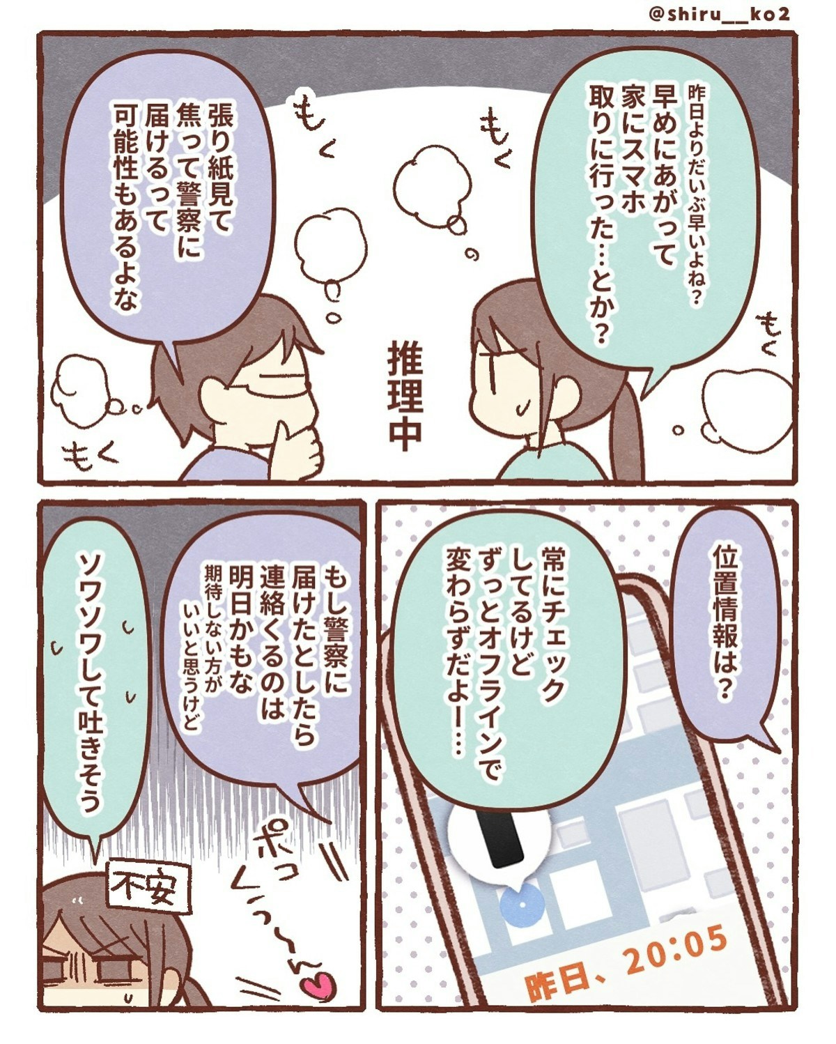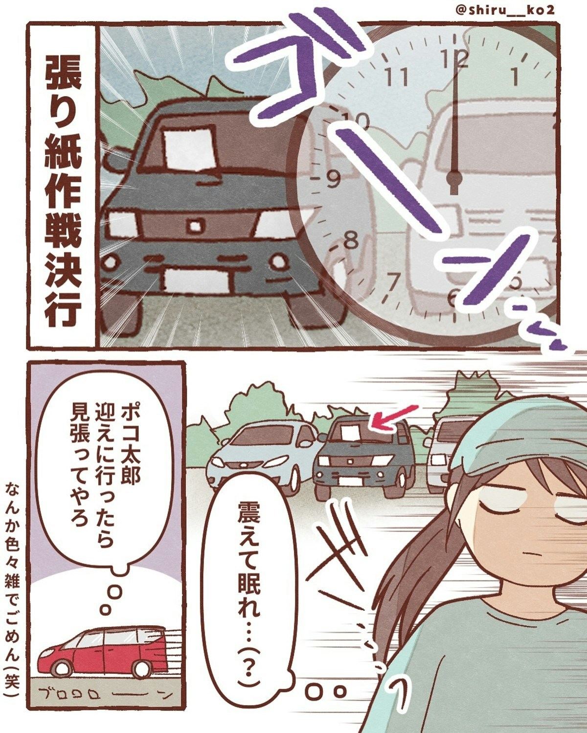 スマホを拾った犯人の車に、「張り紙作戦」を決行することにした、しる子さん夫婦。翌日、いよいよ 張り紙作戦を決行します。すると、決行の20分後には張り紙がなくなっていて…。