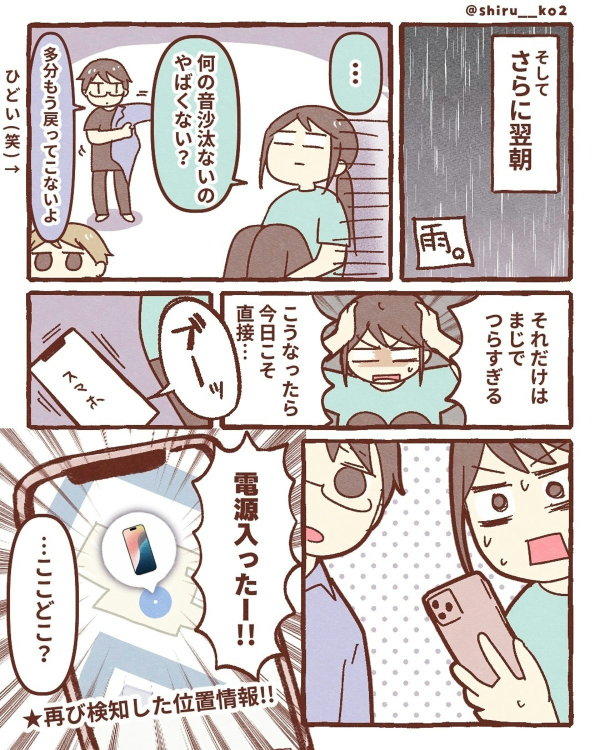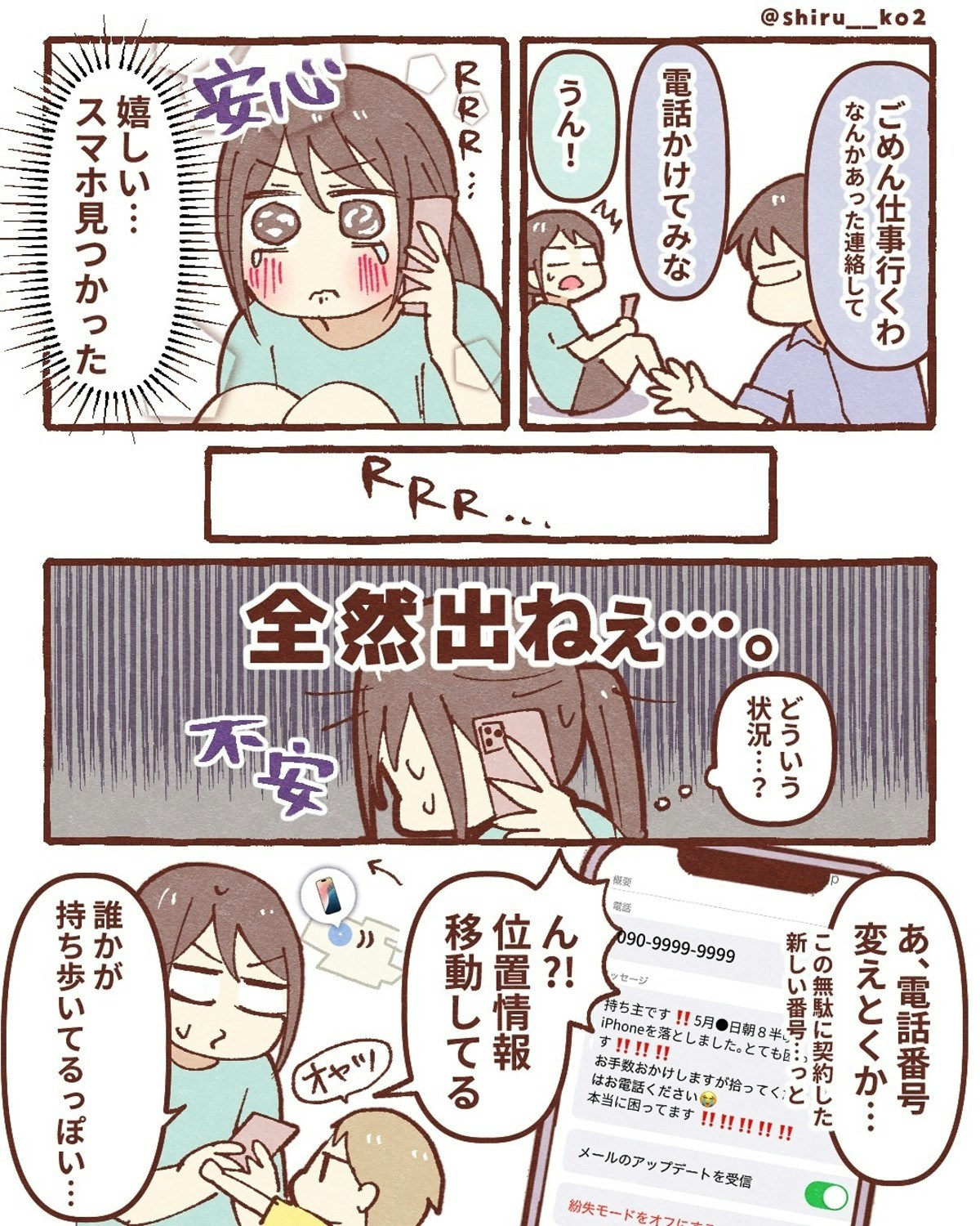 電源が入り、スマホの位置情報がわかったことで、電話をかけてみた しる子さん。電話はつながりませんでしたが、位置情報が移動していることに気づきます。すると、突然、電話が鳴り…。