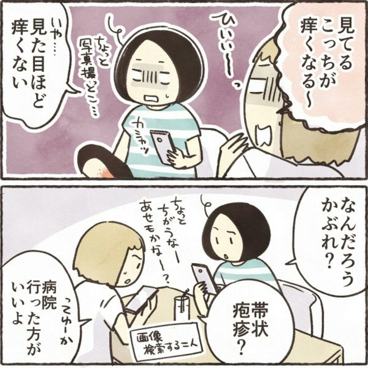 そこには真っ赤な湿疹ができていました。見た目はかなり衝撃的でしたが、意外にもかゆみはそれほど強くないそうです。友人からも病院を勧められました。