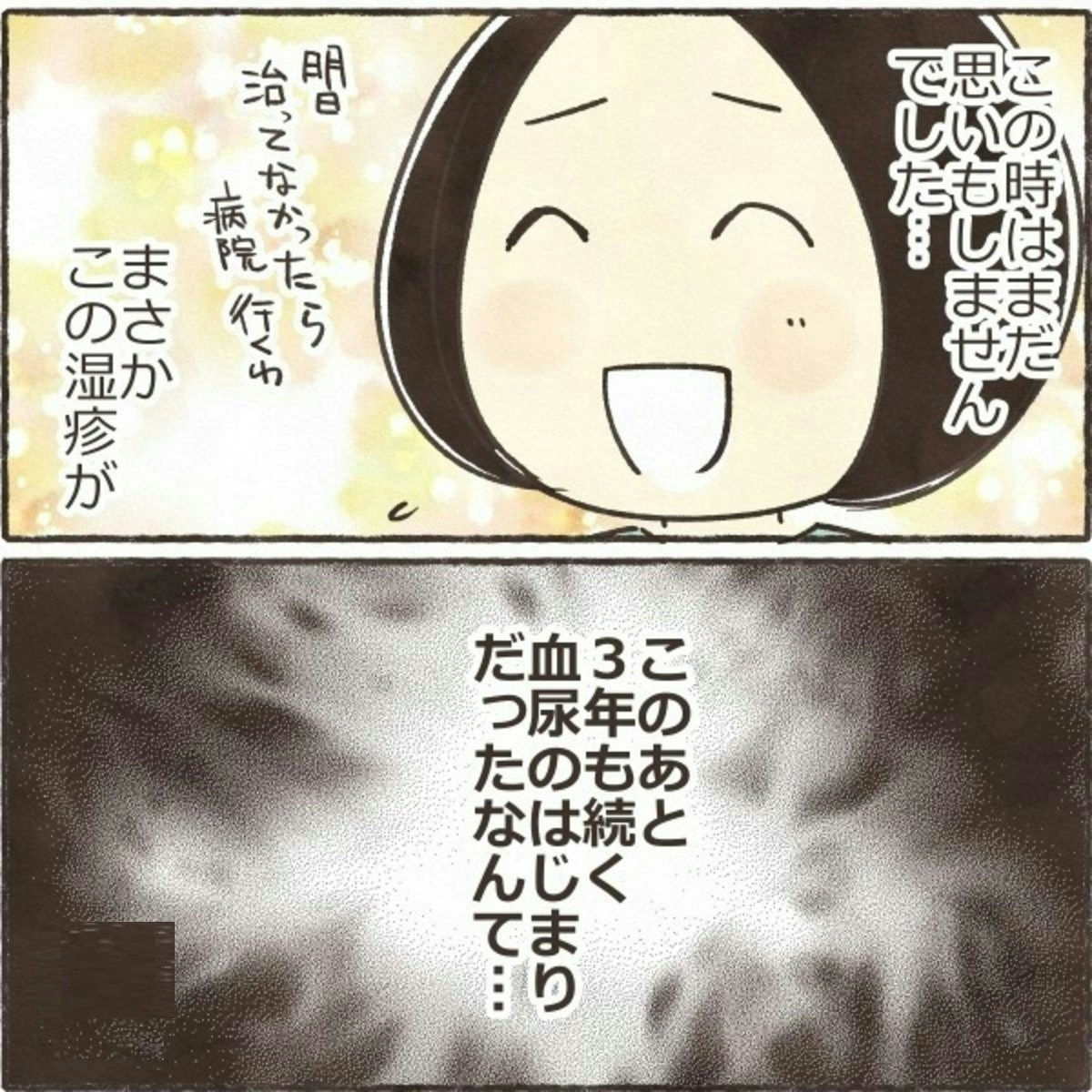 突然現れたふくらはぎの湿疹から、予想もしなかった血尿との闘いが始まったきなこさん。この湿疹をきっかけに、きなこさんの体にはどんなことが起こっていくのでしょうか。