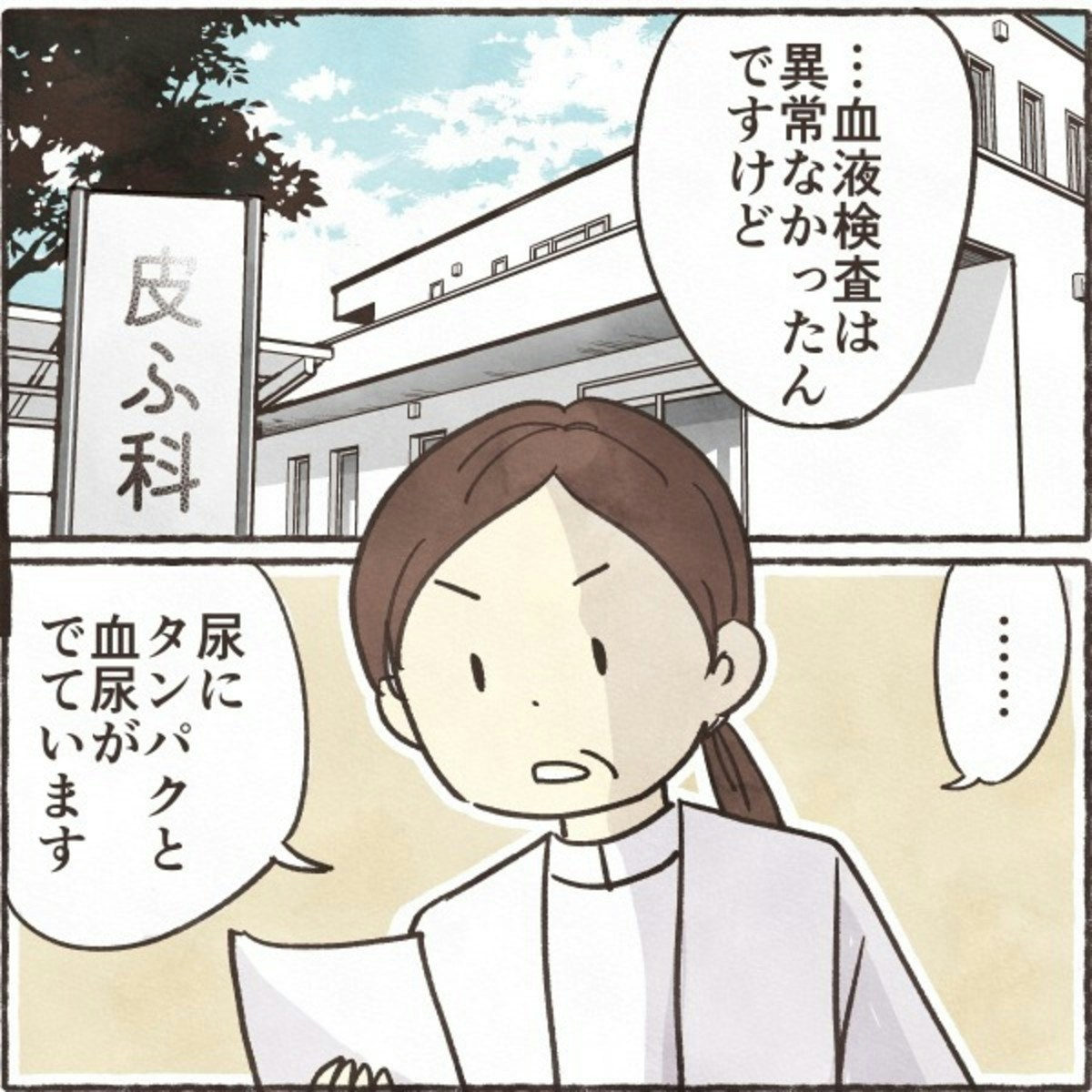 皮膚科で告げられたのは予想外の結果でした。腎障害を併発しているかもしれないという先生からの言葉に、きなこさんは驚きを隠せません。