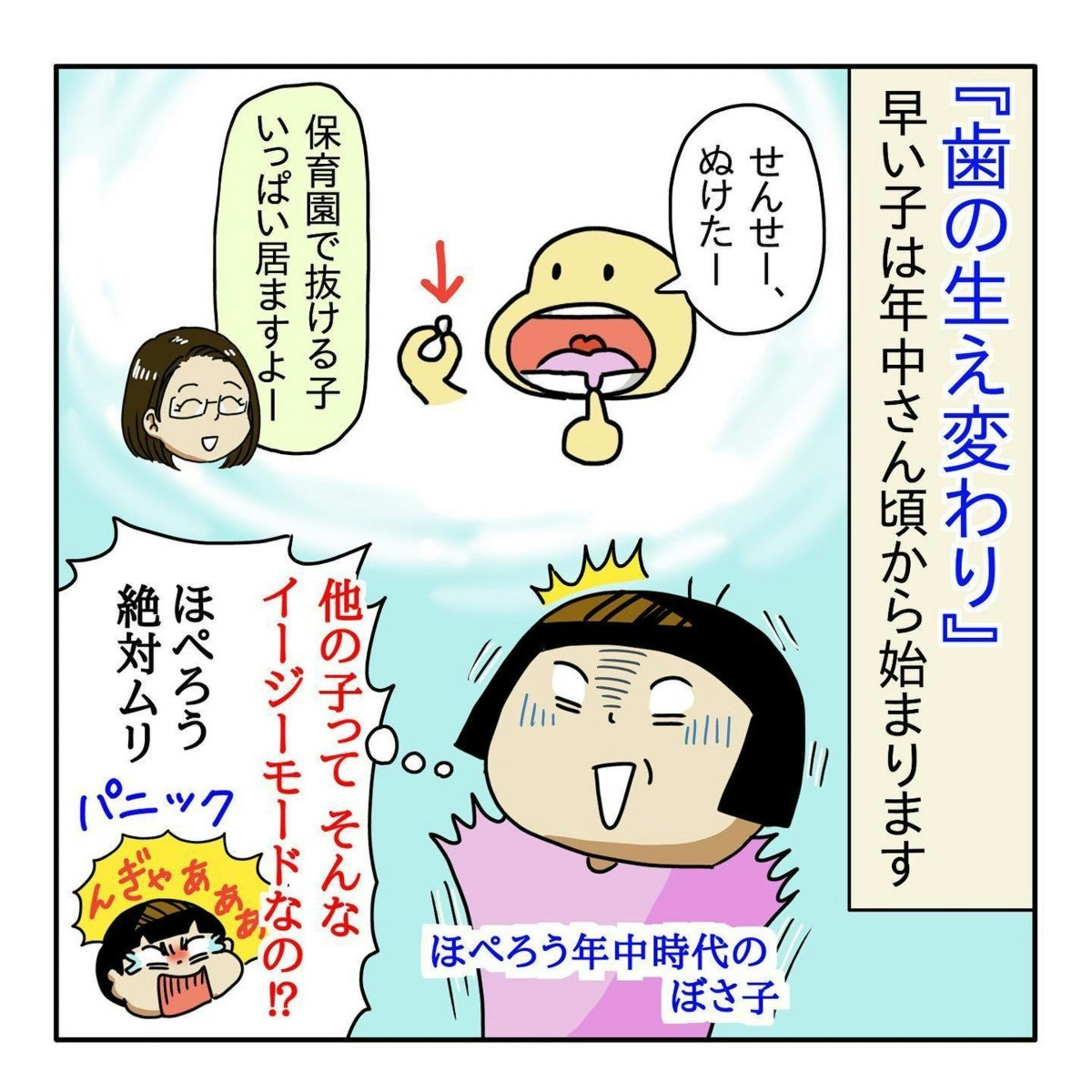 「歯の生えかわり」が始まると、ほとんどの子どもたちは、歯が抜けたことを普通に報告するくらい、何でもないことです。ですが、感覚に敏感なほぺろうくんは、「絶対に大変だろう」と、ぼさ子さんは危惧しています。