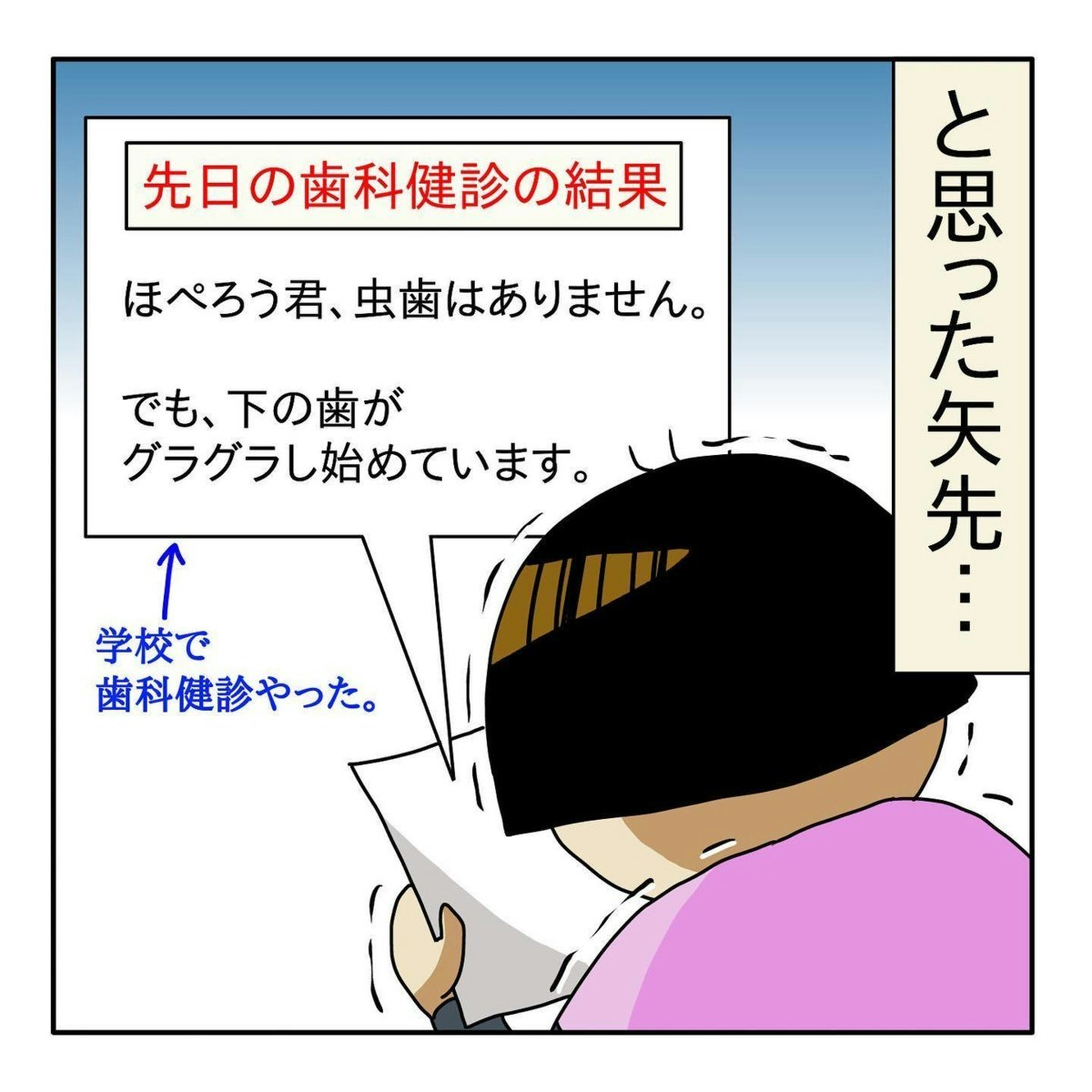 歯科検診の結果、ついに、「ほぺろうくんの歯がグラグラし始めている」というお知らせが届きました。ほぺろうくんは、ぶじに歯の生えかわりを乗り越えられるのでしょうか。