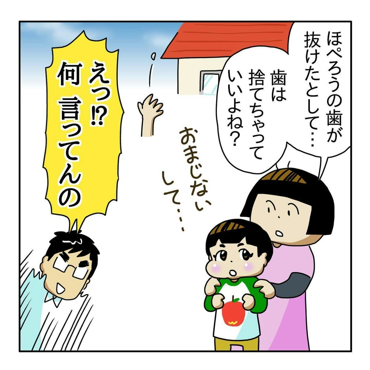 ほぺろうくんの抜けた歯は捨てるつもりだった、ぼさ子さん。夫はおどろいた反応です。