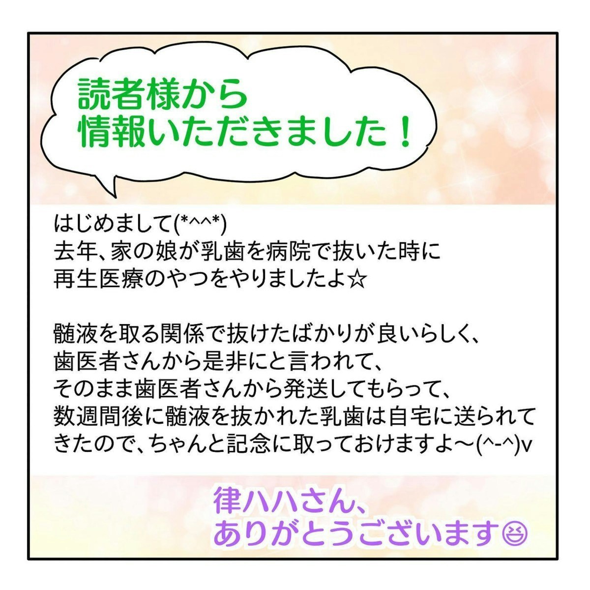 「再生医療」のために乳歯を保管する、という記事もありました。夫の要望どおり、ほぺろうくんの歯は取っておくことに…。