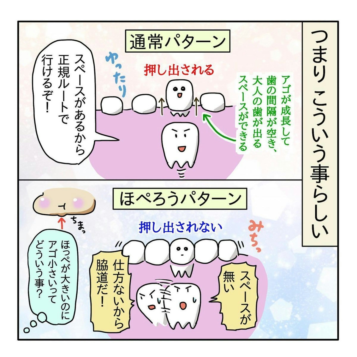 アゴの小さいほぺろうくんの場合、あたらしい歯が生えるスペースがなく、わき道に逸れて歯が生えてしまうのだそう。