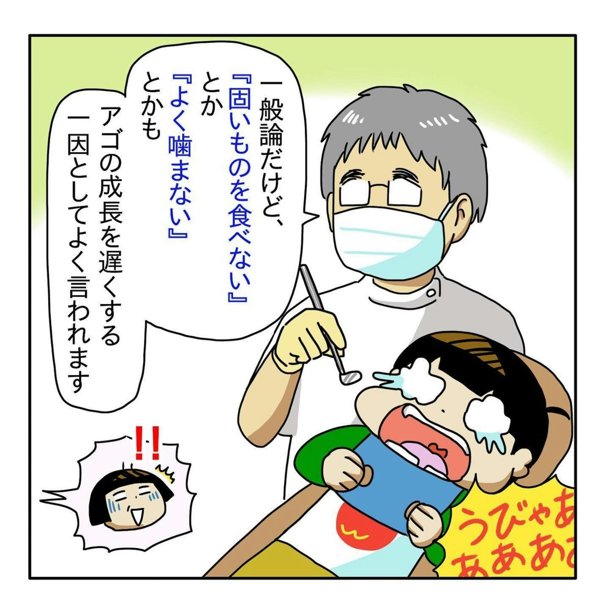 永久歯の不安要素について、説明を受けた ぼさ子さん。原因として考えられる、アゴの成長について、偏食も考えられるものの、「遺伝が一番の理由かもしれない」…と、ぼさ子さんは心当たりを探ります。
