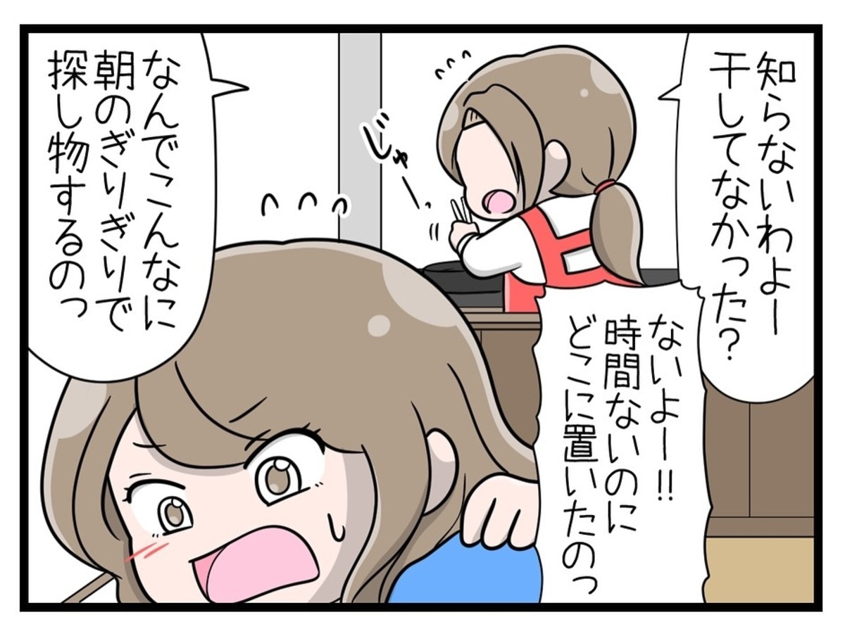 ある朝の忙しい時間、キッチンに立つ母親と娘の慌ただしい会話が聞こえてきます。