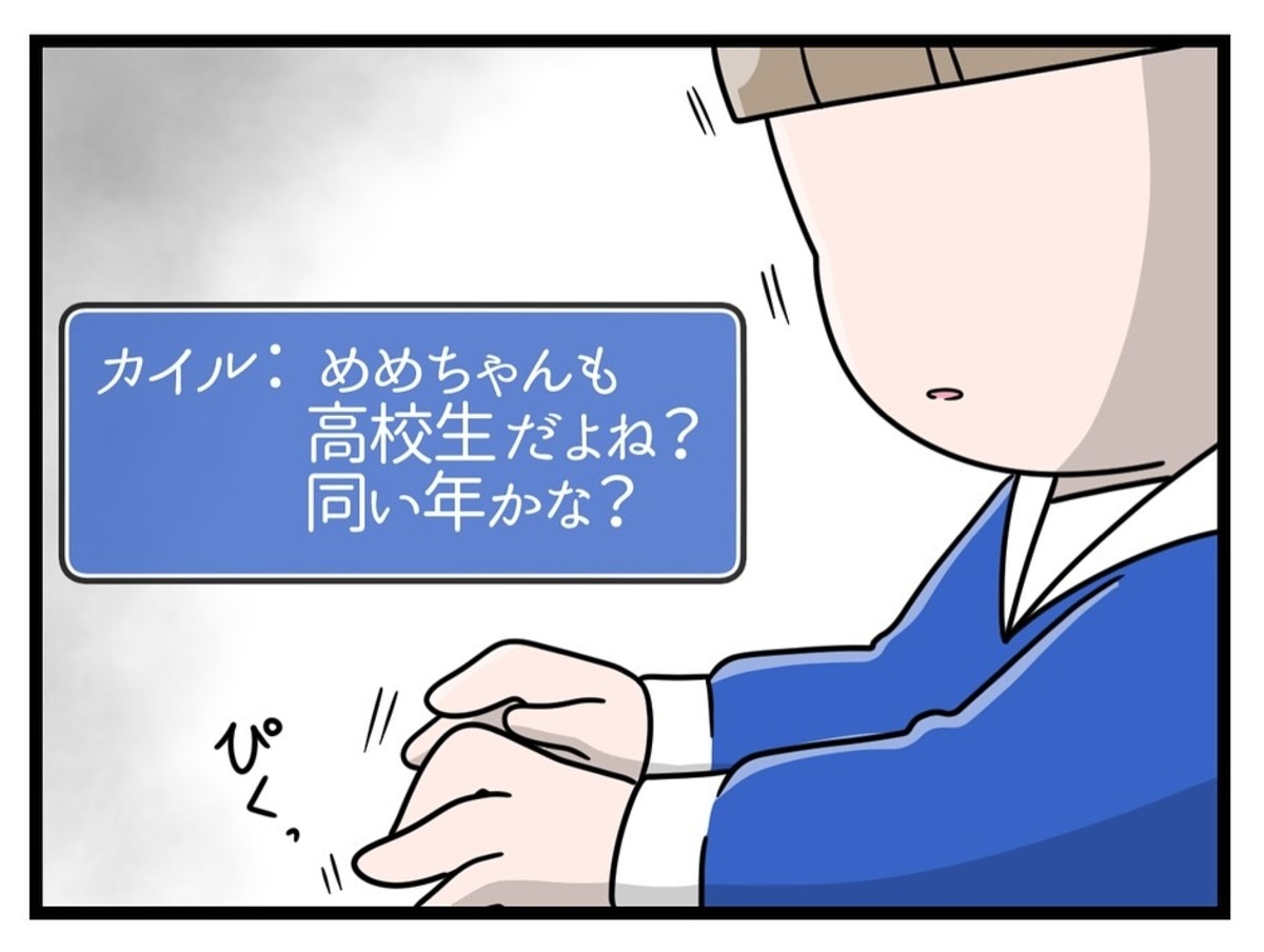めいさんは、ゲーム内で友だちになった「カイル」と仲良くなり、ゲームよりも雑談をよくするようになります。カイルは「高校2年生」だとわかると、めいさんは中学生なのに「高1」だと嘘をついてしまいます。