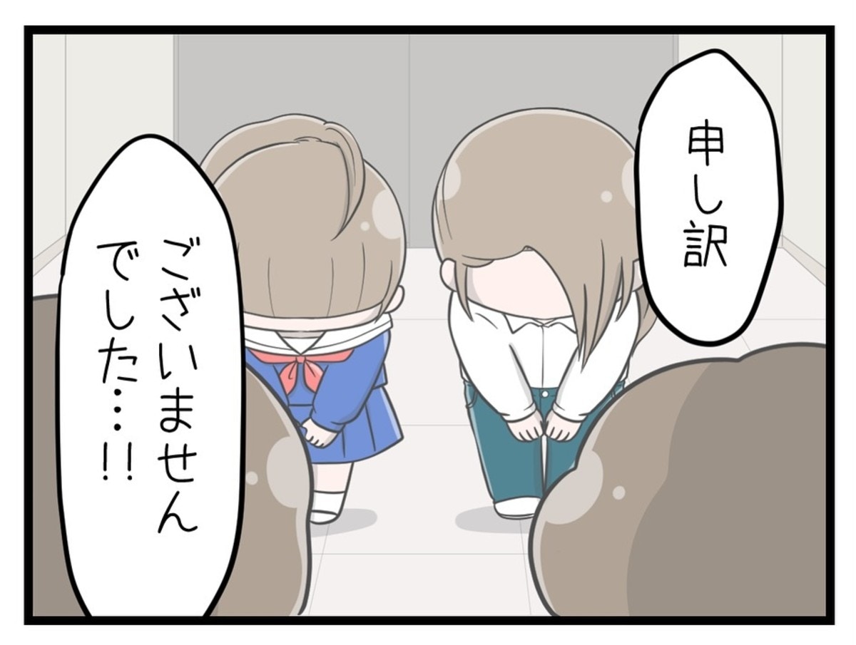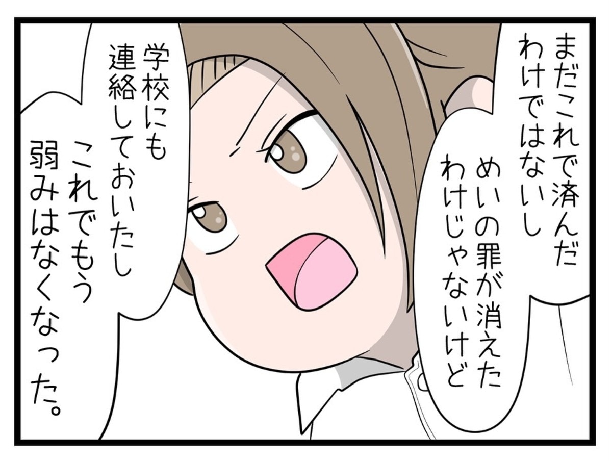 めいさんと母親は、「当て逃げ」だと脅されていた件を、車の持ち主への謝罪と修理代を払うことで解決させました。母親はめいさんに「わざとではなくても逃げてはダメ」と諭します。中学校にも事情を伝え、相手が脅す理由をなくしていきました。