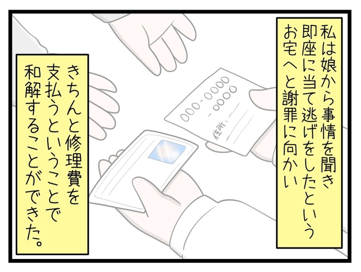 めいさんと母親は謝罪と修理代の支払いをしました。これで、当て逃げの件は相手と和解することに。