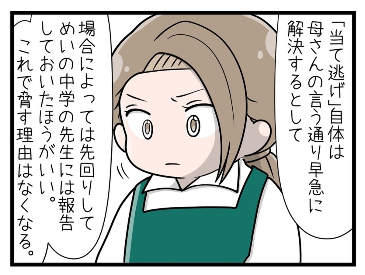 「当て逃げ」の件は解決、そして中学校へ報告もしました。それでも相手が脅してくるようなら、めいさんが撮ったスクショを使って撃退をしようと長男は考えているようです。