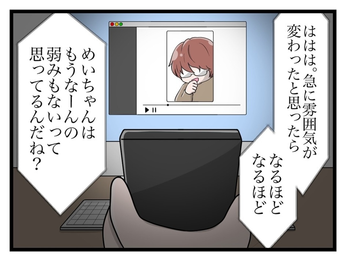 めいさんを脅した相手「かい」は、今までのメッセージのやり取りとビデオ通話が残っていると言われて焦り始めます。これより前のこと、相手を撃退するため、長男がめいさんが撮った1枚のスクショを元に証拠を捏造しようと作戦を立てていて…。