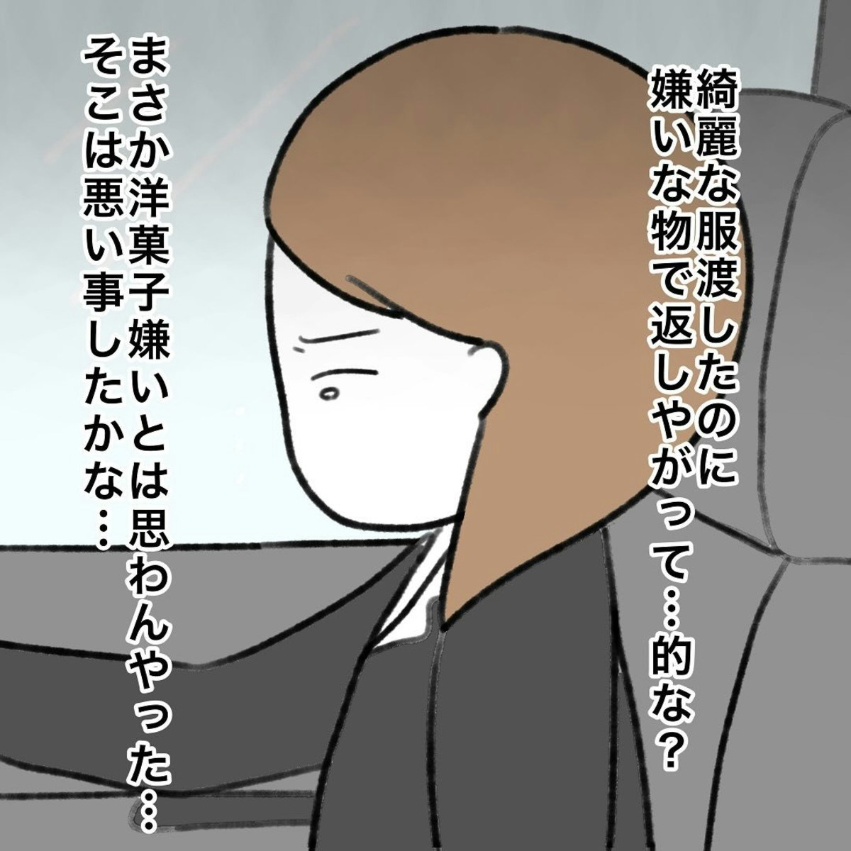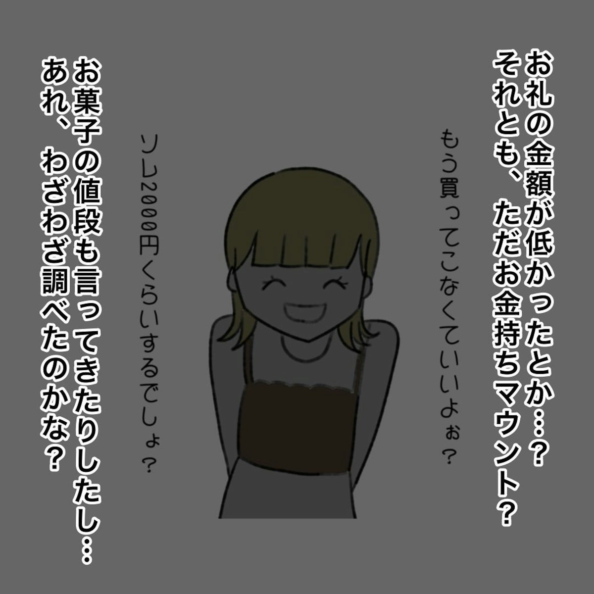 仲良くなった渡部さんが息子さんのおさがりをもらってからというもの、「子どもの服、買えないんでしょ?」など、他にも見下した発言をされるように。渡部さんに驚いたかかじりさんは、関係に一線を引きつきあっていましたが、再び渡部さんからおさがりの入った袋を渡されます。そして以前、かかじりさんがお礼に渡したお菓子について、「大っ嫌い」「処理するの大変だった」と言い放ったのでした。
