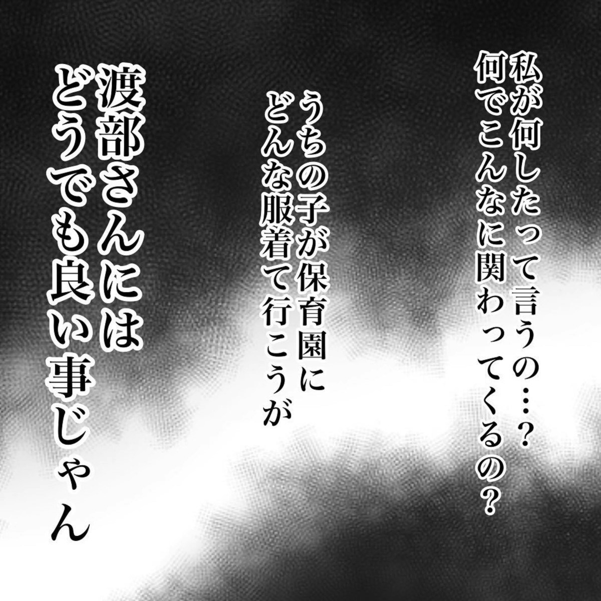 翌日、かかじりさんは勇気をだして声をかけます。さんざん嫌がらせをしておきながら、ニコニコしている渡部さんに「おさがりの嫌がらせをやめてほしい」というと笑顔ではぐらかします。そして極めつけに、子どもにいつも同じ服を着させていて不憫だと発言したのでした。
