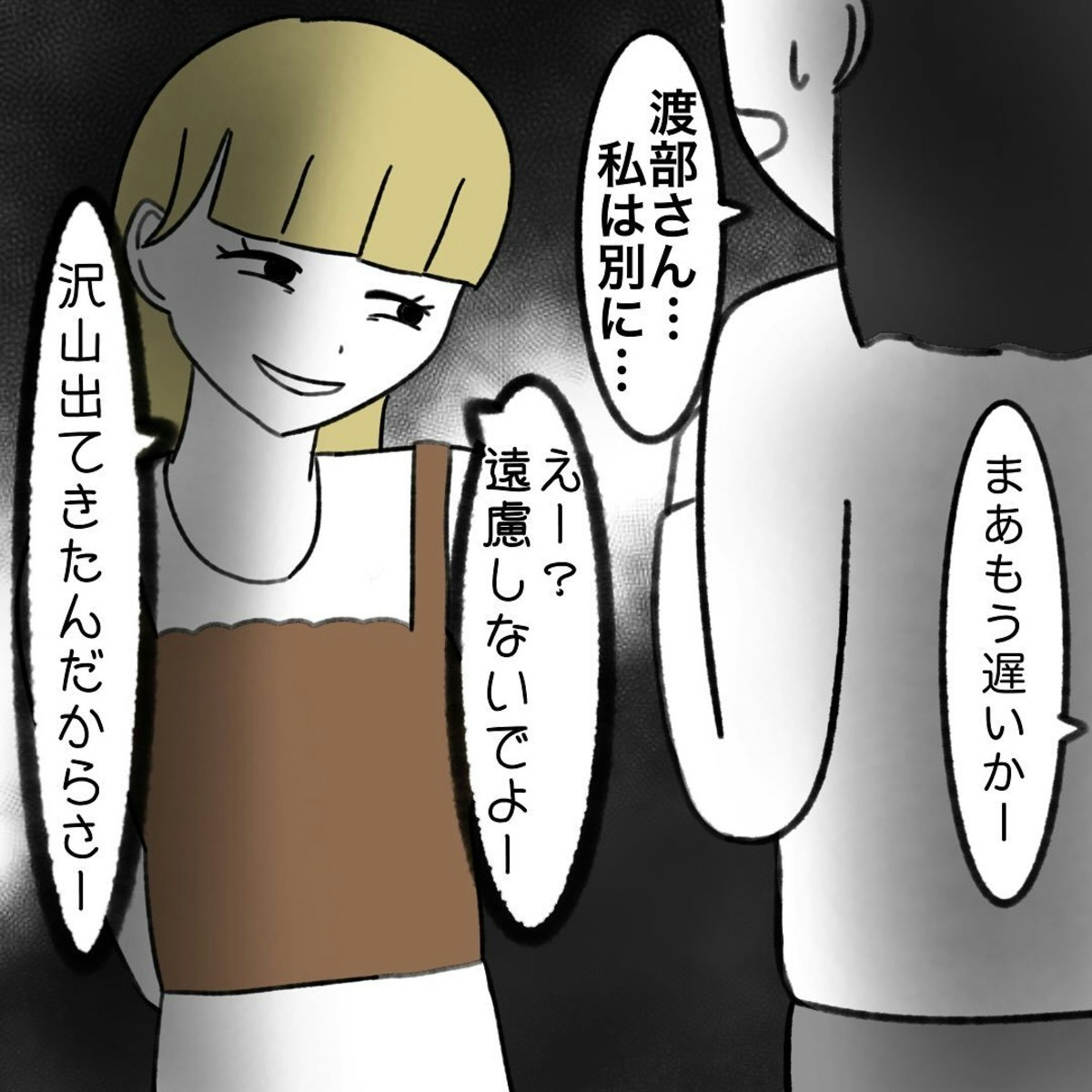 それから、渡部さんの自称おさがりによる嫌がらせはなくなりました。そしてある日、お迎えで歩いていた渡部さんをかかじりさんは呼び止めたのでした。