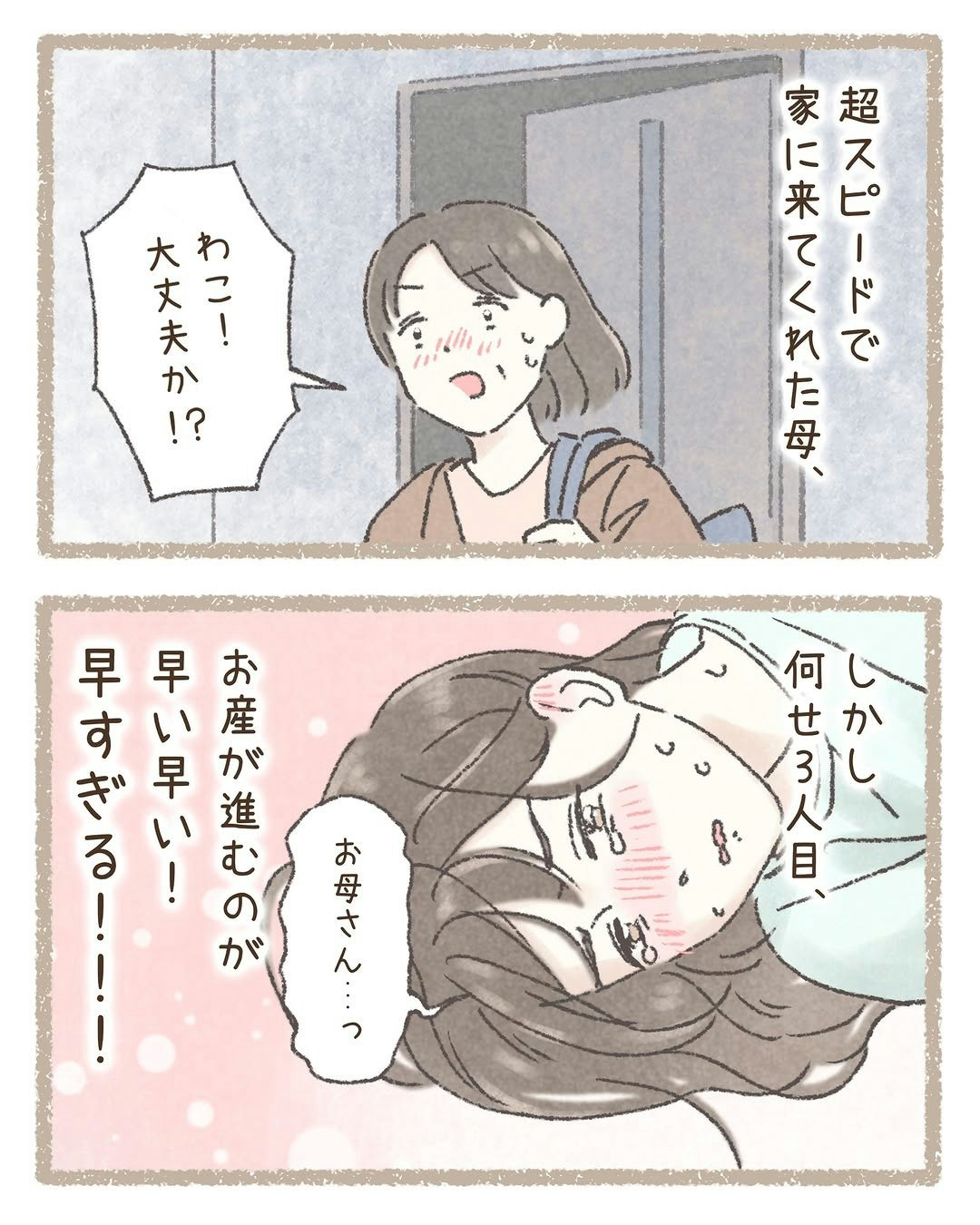 娘のピンチに、大急ぎでやって来たお母さん。「大丈夫か」と声をかけくれますが、3人目出産となる経産婦のわこさんのお産は、どんどん進んでしまいまっている様子です。