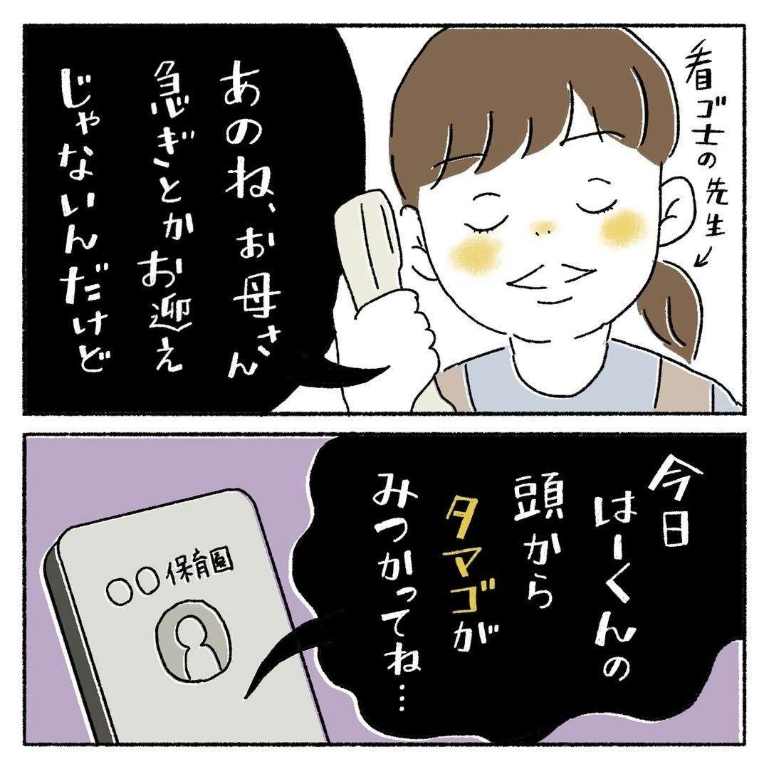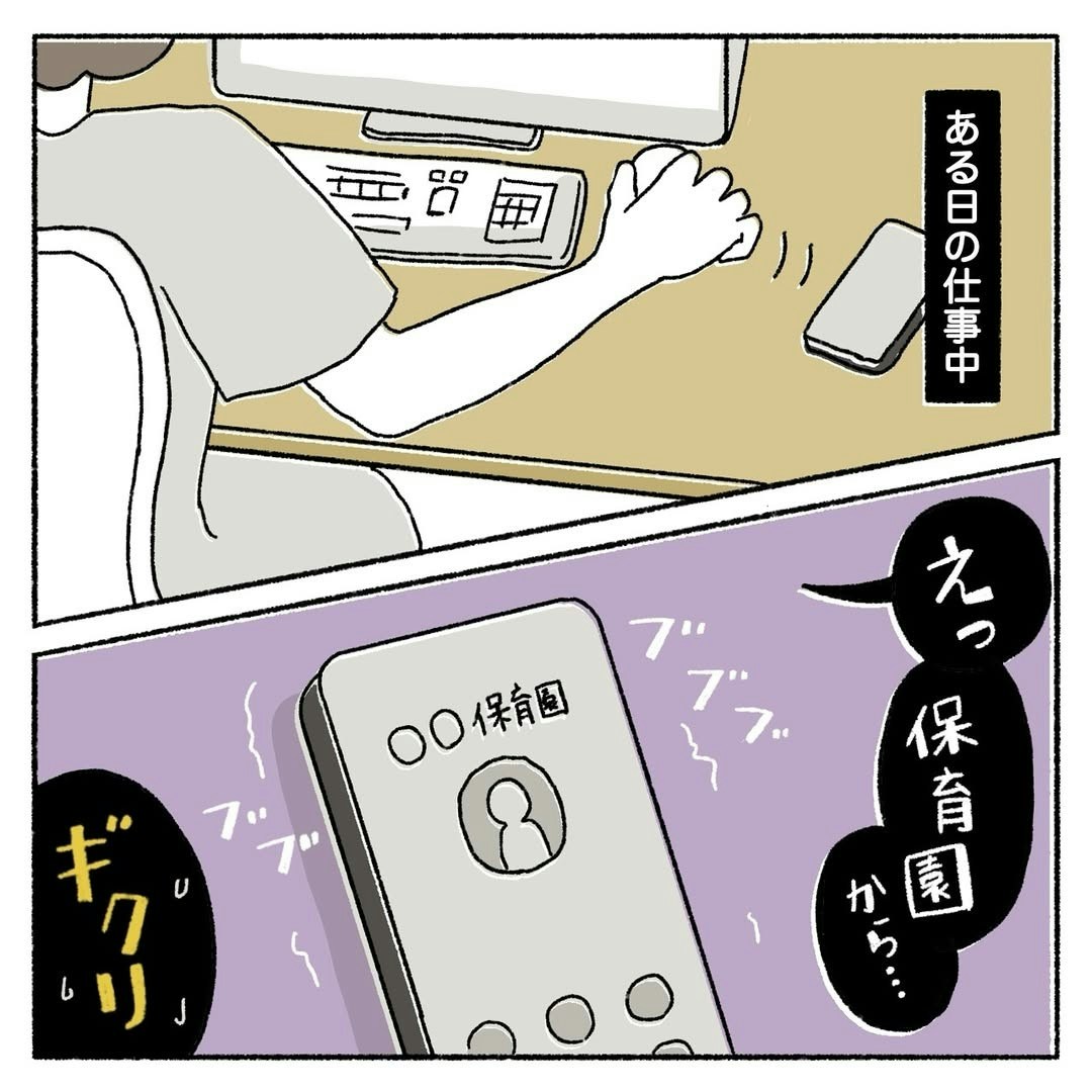 仕事中のカカさんに電話がかかってきます。それははーくんが通う保育園から。嫌な予感とともに、電話に出るカカさん…。