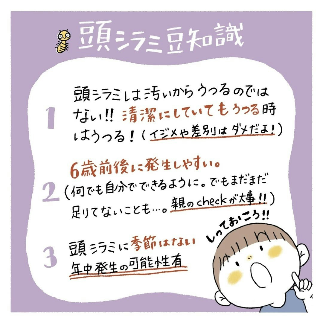 お母さんのカカさんは慌てずに皮膚科を受診し、薬局で専用のシャンプーや櫛を準備して家族で対処。医師の指示や使用ルールを守ってケアしたことで、無事にはーくんの頭からシラミはいなくなりました。シラミは病気ではなく、衛生状態のせいでもありません。適切に処置すれば、一定期間でしっかりいなくなるものです。