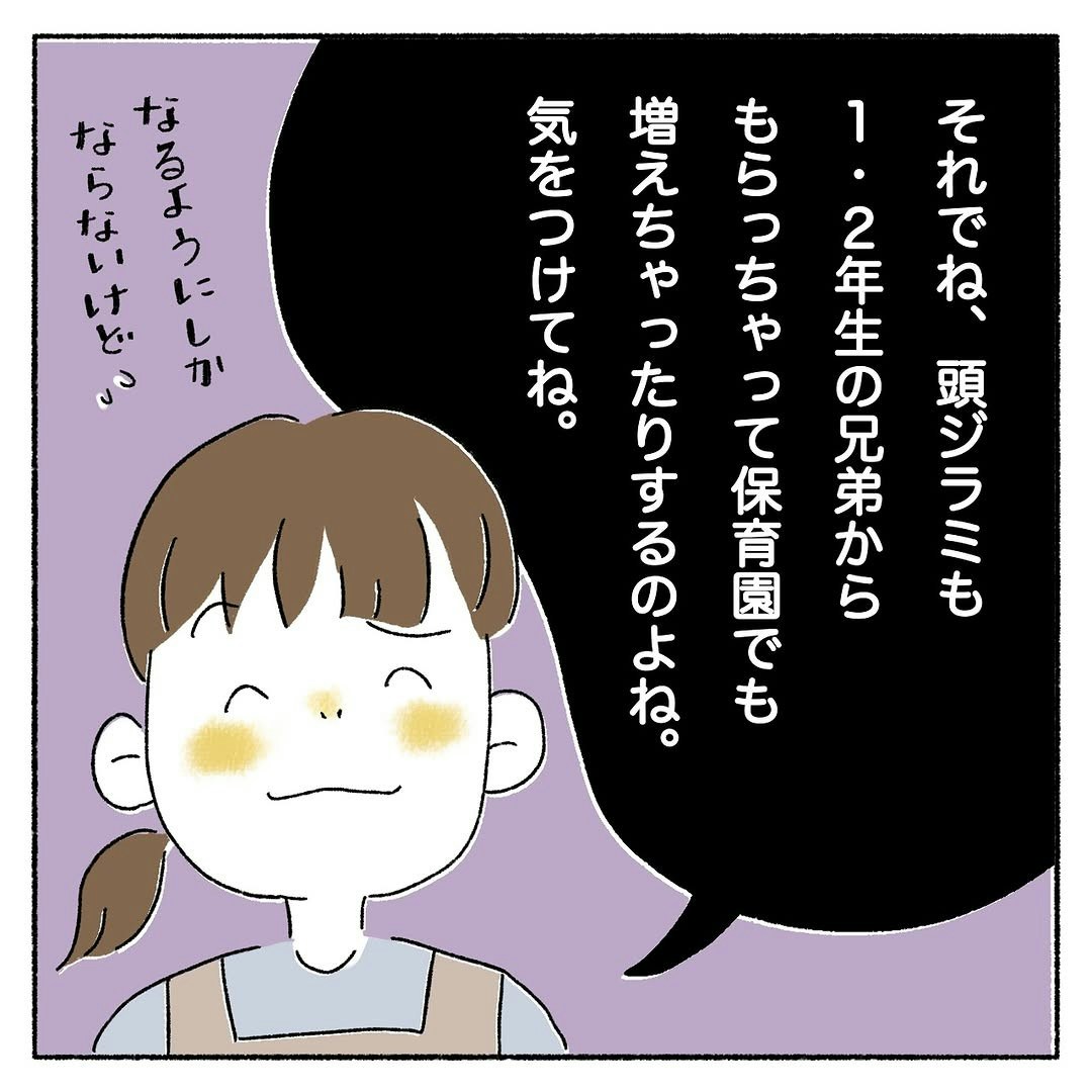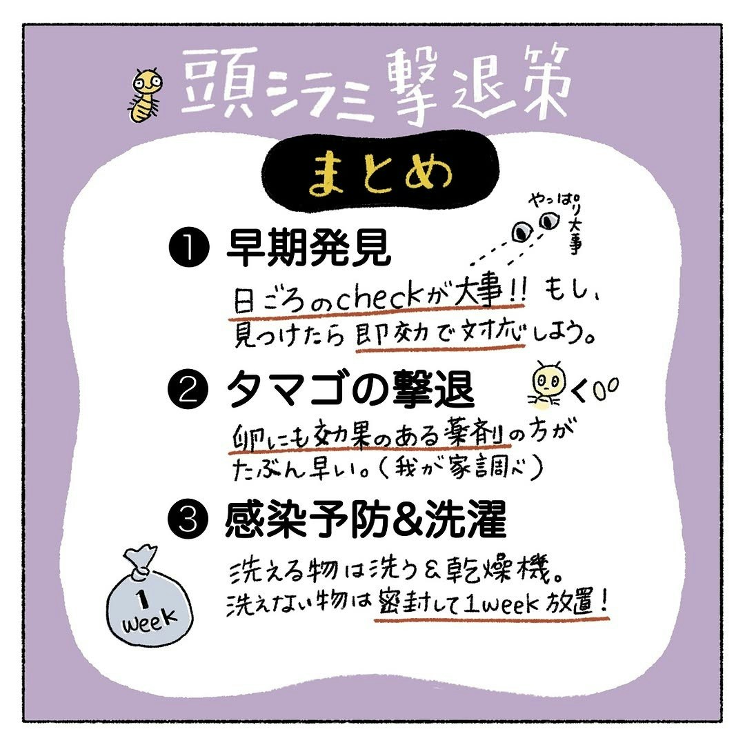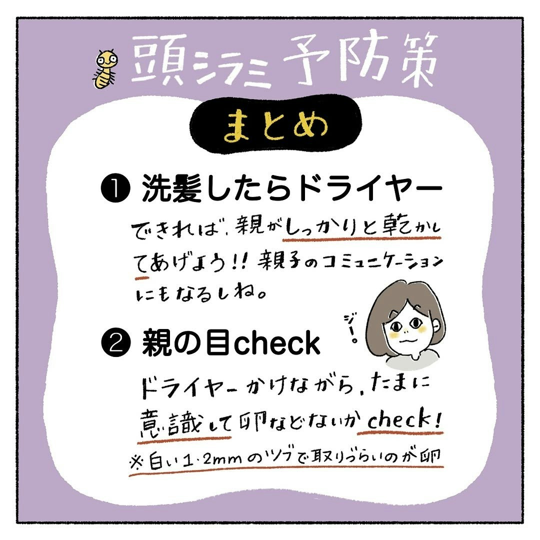 頭ジラミは病気ではありません。季節も問わず、いつまたなるかもわからないもの。そのため、定期的なチェックやお風呂上がりのドライヤーはしっかりと行っていくよう、看護師さんからも念を押されるハルマンガさん。