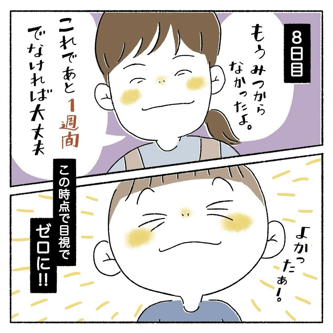 そして5日目には卵が一つだけ、8日目にはついに、目視で卵が確認できなくなりました。これで一週間卵が見当たらなければ、頭シラミからは解放されたことになります。はーくんもうれしそうです。