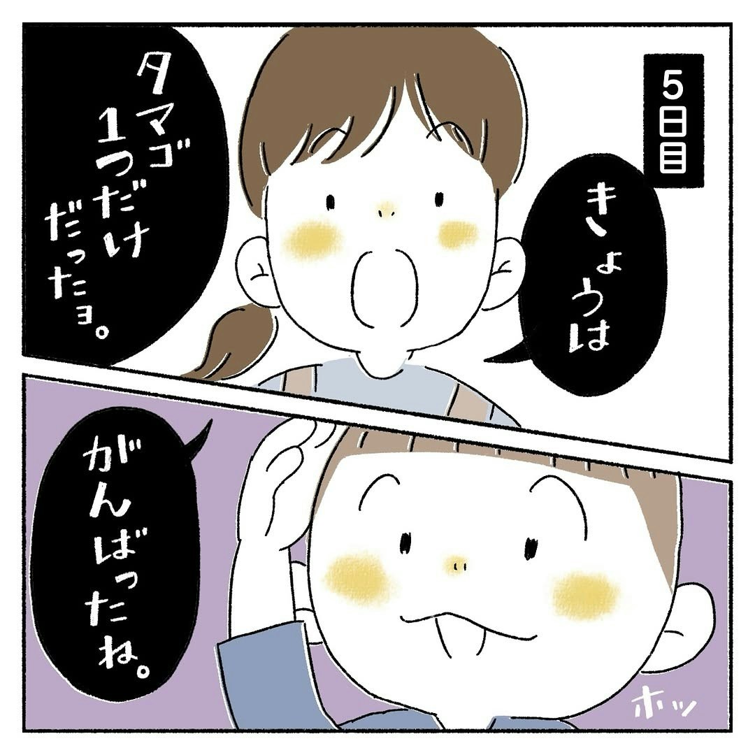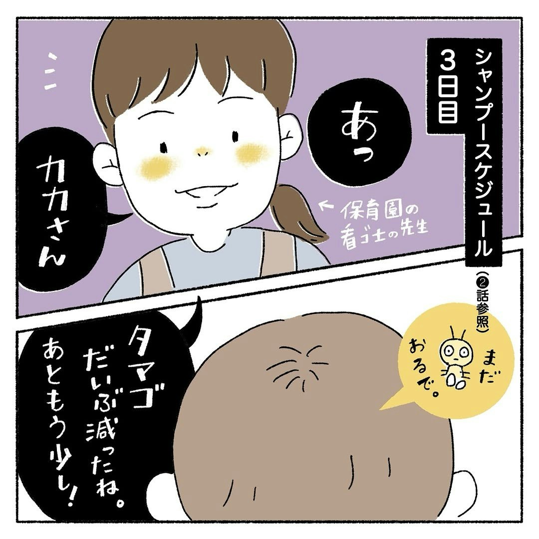 シラミ撃退作戦を開始し、シャンプー使用から3日後になって、頭の卵がかなり減って来たはーくん。保育園の看護師の先生も、「あともう少し!」とハルマンガさんたちを励まします。