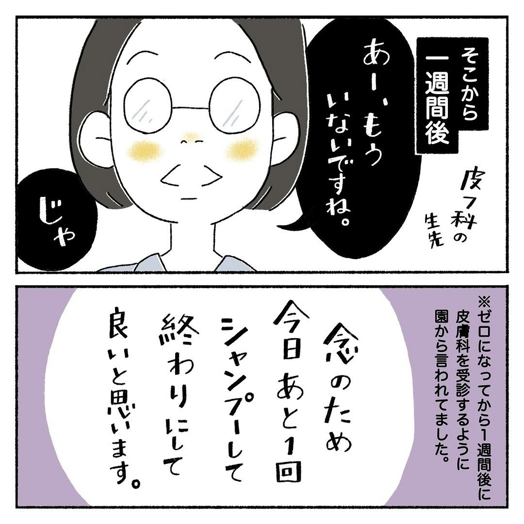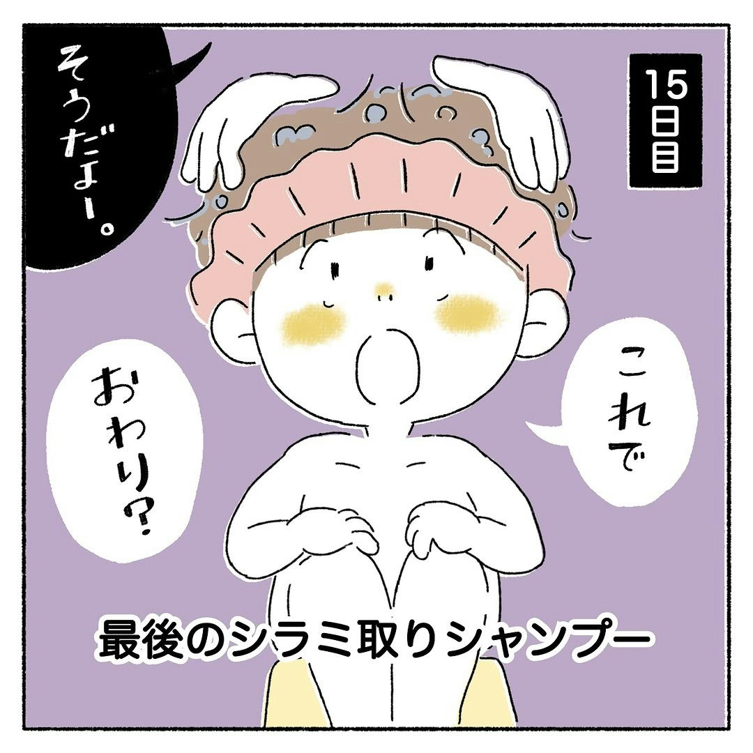 目視ゼロから一週間後、皮膚科を受診したところ、シラミはもういないとお墨付きをもらいました。作戦開始から15日目、最後のシャンプーを使って、いよいよ撃退作戦完了です。