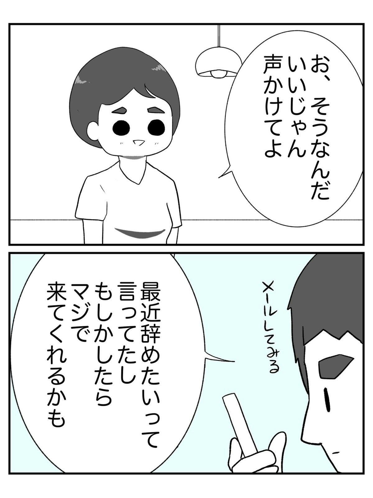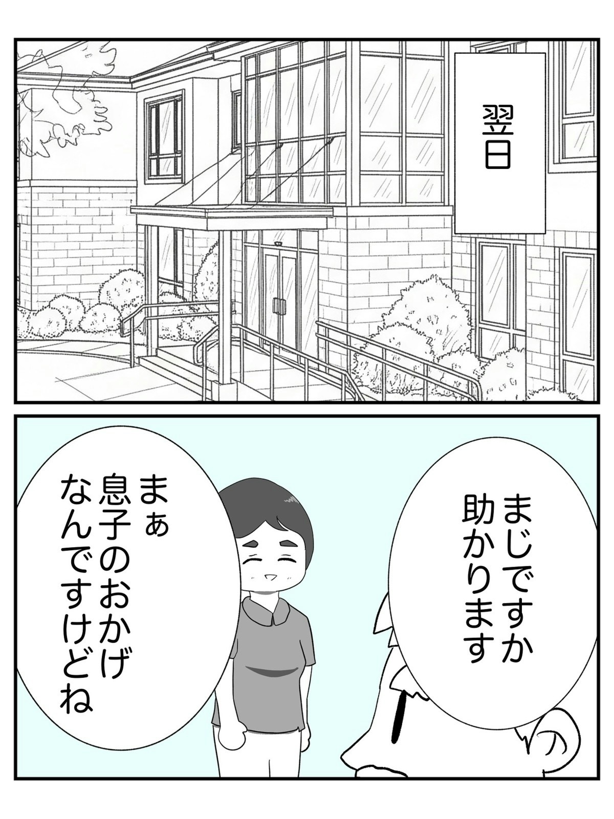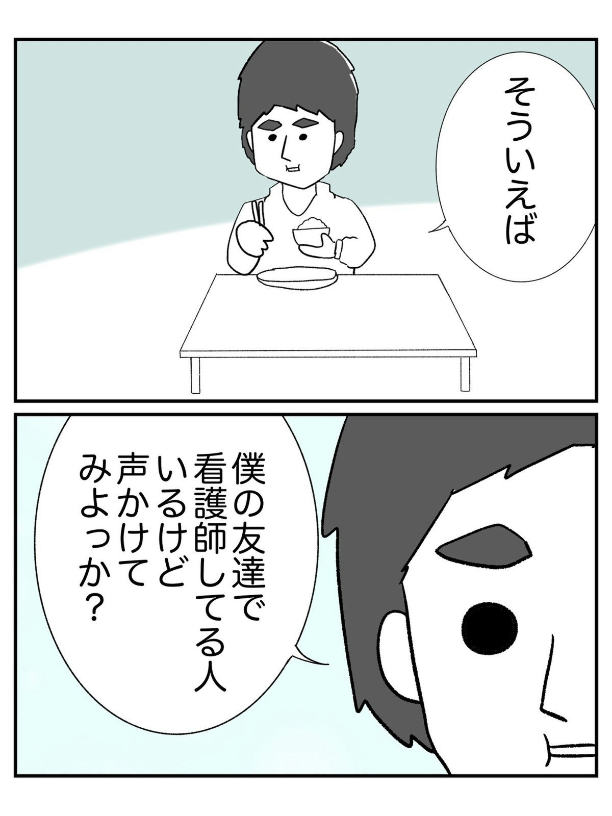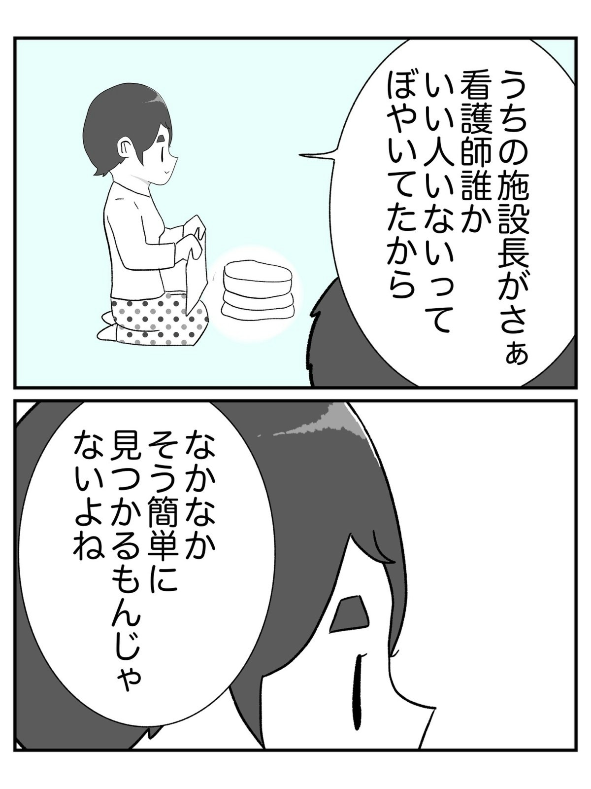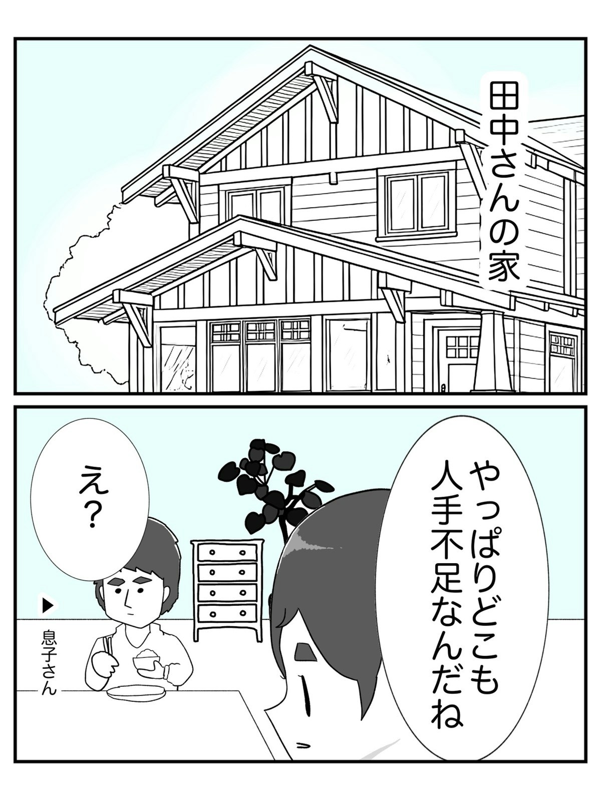 看護師を探している施設長の悩みを聞いた田中さんは、帰宅後に家で息子と話をしていると、最近辞めたいと言っていた看護師の友達に声をかけてくれることになりました。新しい看護師候補は、意外にもすぐ見つかりそうです。