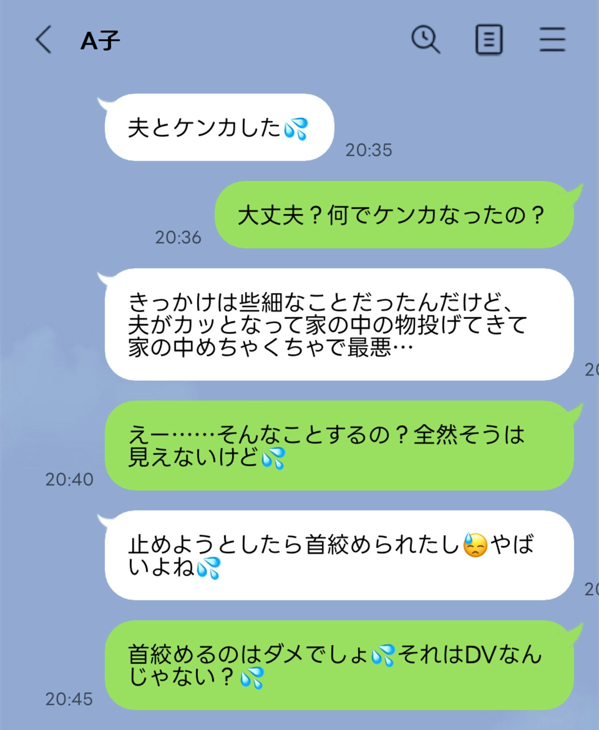 歳も私の旦那と同じで、思考も旦那そっくりなので余計に親しみやすいのかもしれないですが、実はこの旦那さんDVモラハラ男で時々友人からLINEが来ます😅