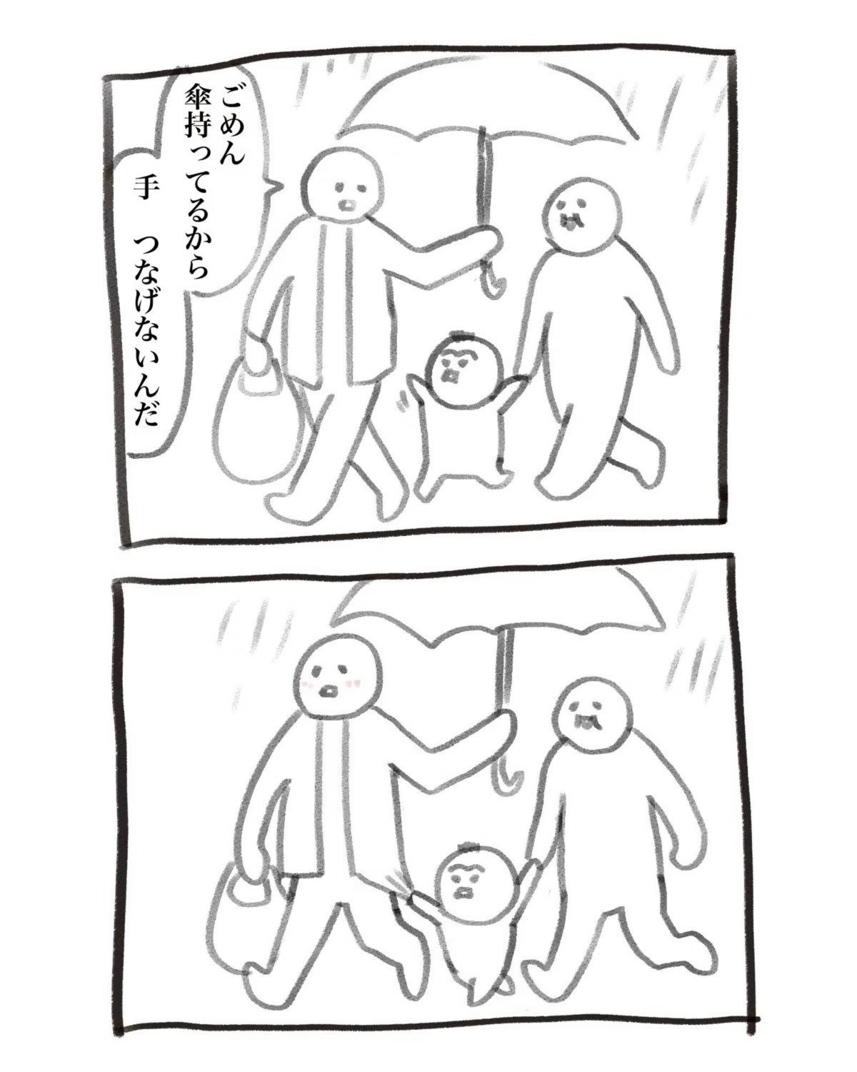 お父さんが買い物袋を持ち、傘をさして歩いています。お子さんと奥さんが雨に濡れないようにという、パパの優しさがうかがえますよね。このとき、息子がパパと手をつなぎたがりますが、パパの手はふさがっています。