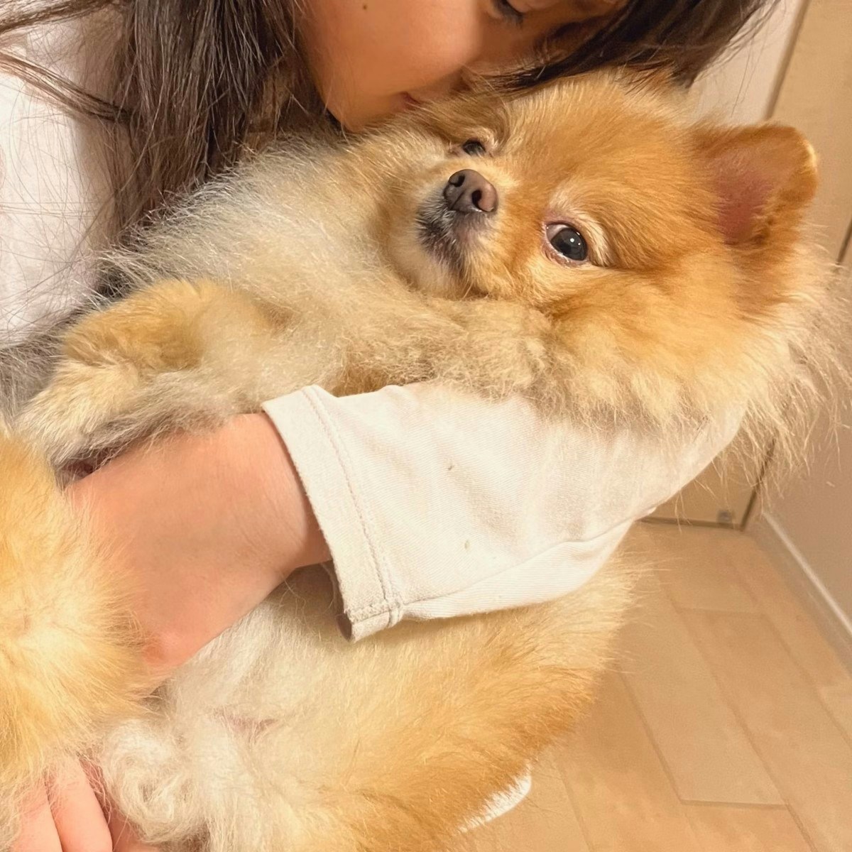 ご紹介するのは、おポメのこむぎくん(@opomenokomugi)さんが投稿した、飼い主に抱っこされるのが大好きなポメラニアンとその「おねえちゃん」の2ショットです。
