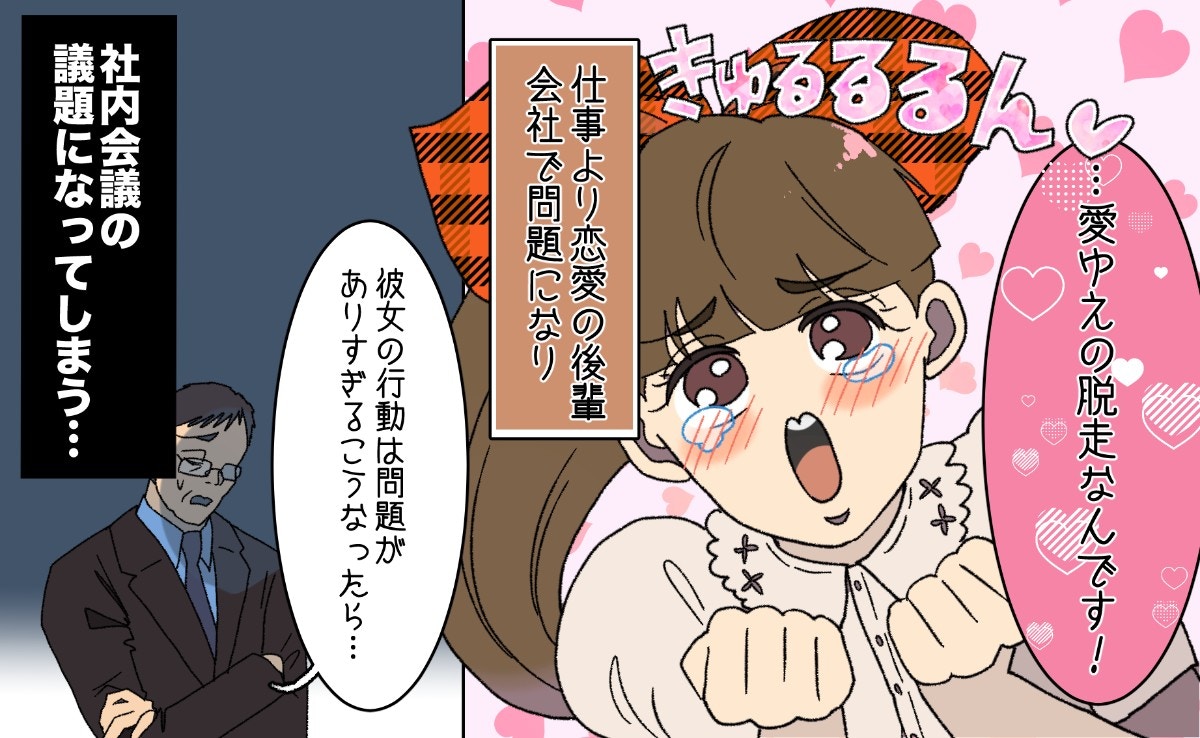 野々花は社長含む会議でも恋愛話を始めるし、得意先との商談にまで惚気話を出してきた。このままでは今後、重大トラブルを招く可能性が高い。