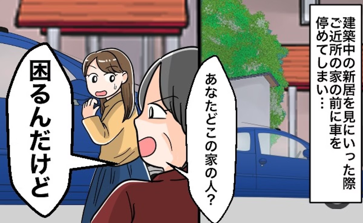 戸建てを新築中の投稿者さん。投稿者さんのお家以外の分譲地は建て終わっており、すでに生活が始まっているようです。その状況の中、メーカーの方から説明を受けに建築中の家に行くと、工事車両が止まっていたので駐車することができなかったようです。