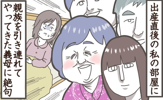 無事出産した主人公・リナ。産後の体はかなり疲れ切っていて、誰とも会う気力が無い様子です。そんな彼女の元へ、義母はとんでもない人たちを連れて突撃してきて…。
