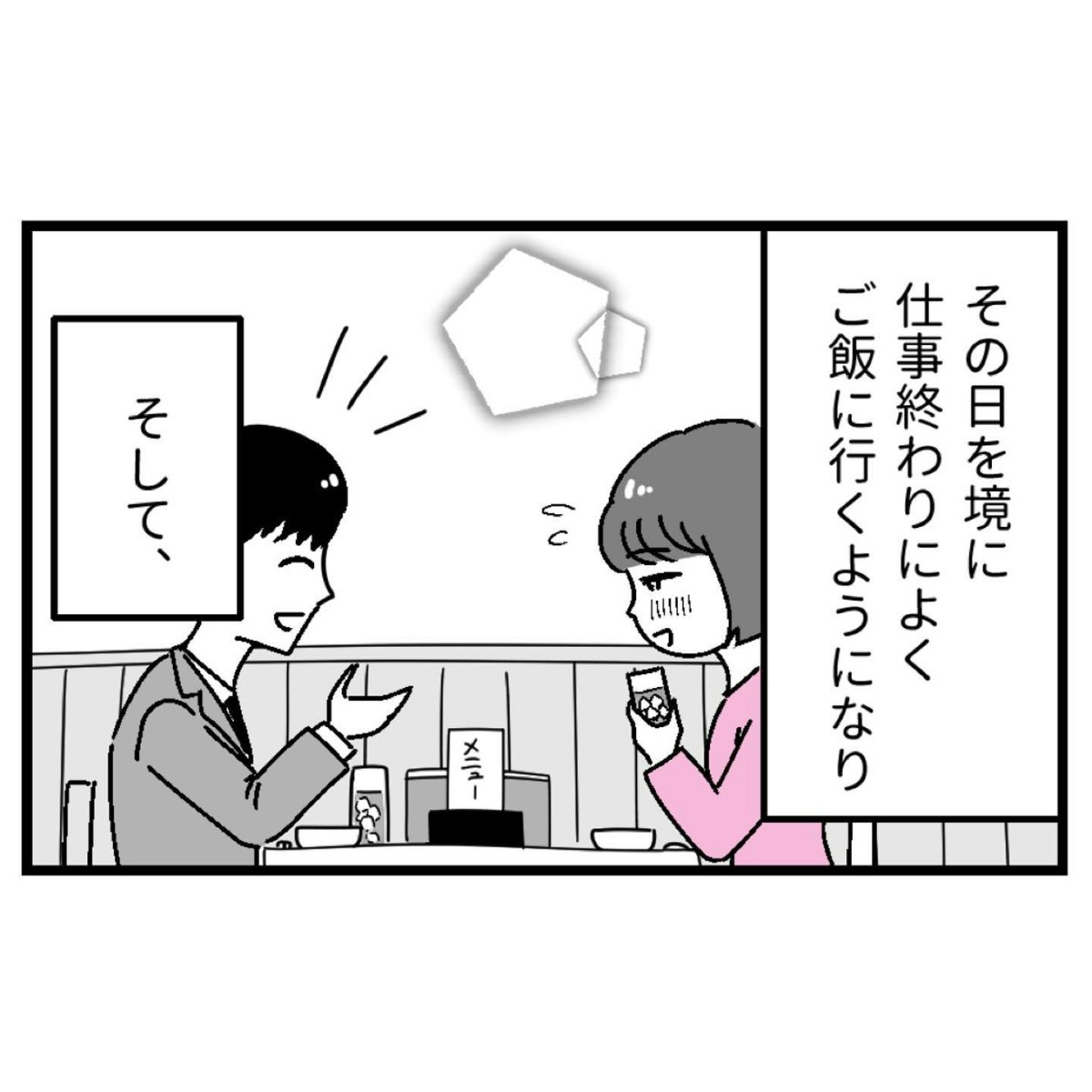 片思い相手からのお誘いに、焦りながらも喜びでいっぱいになる優菜。こうして2人は何度も食事に出かけ、距離を縮めていきます。