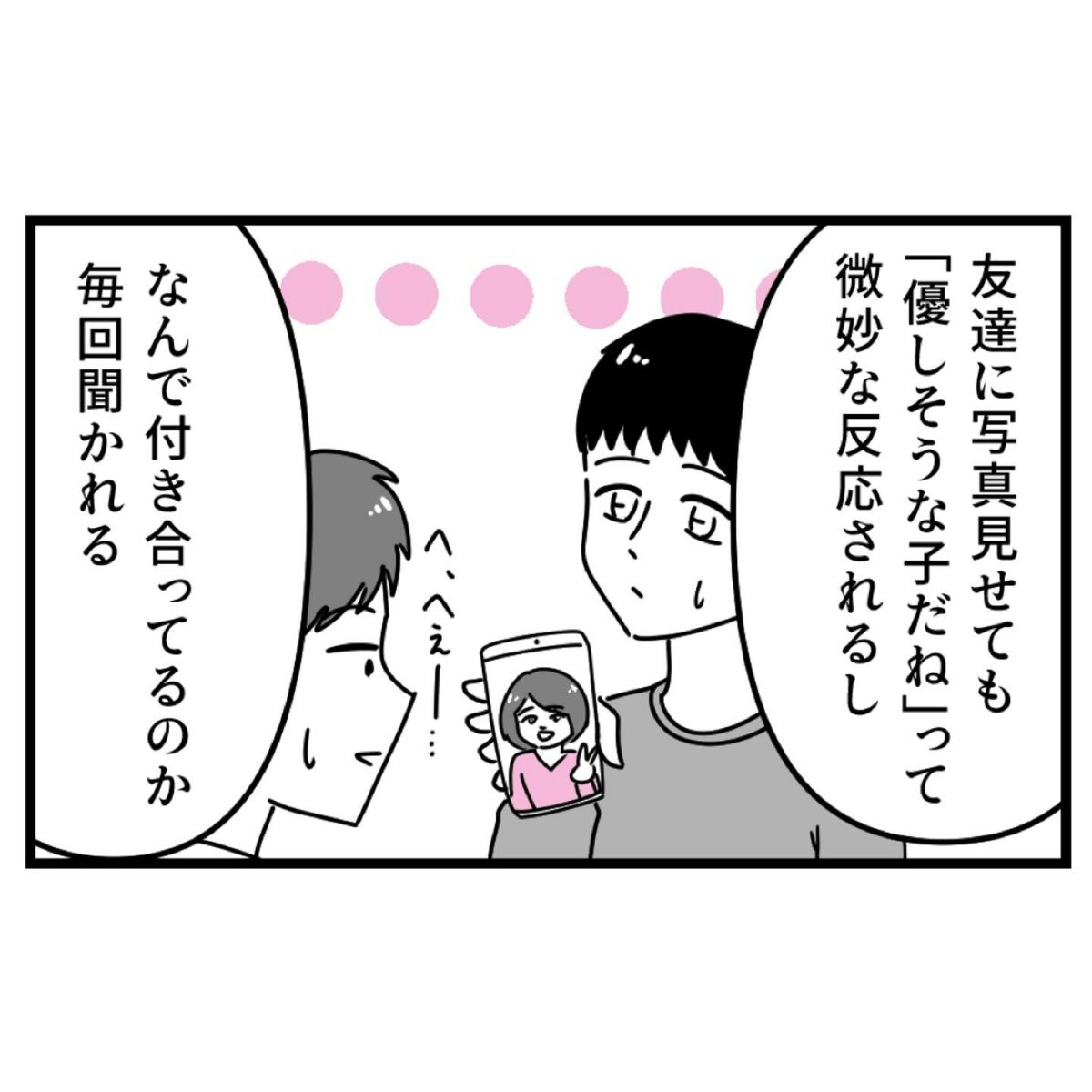 優菜は会社ではブス呼ばわりされているし、友達に見せても微妙な反応。なんで付き合っているのか毎回聞かれることに、うんざりしているそうです。そこは優菜本人に言っていたように「性格が好きだから」と言わないのですね。