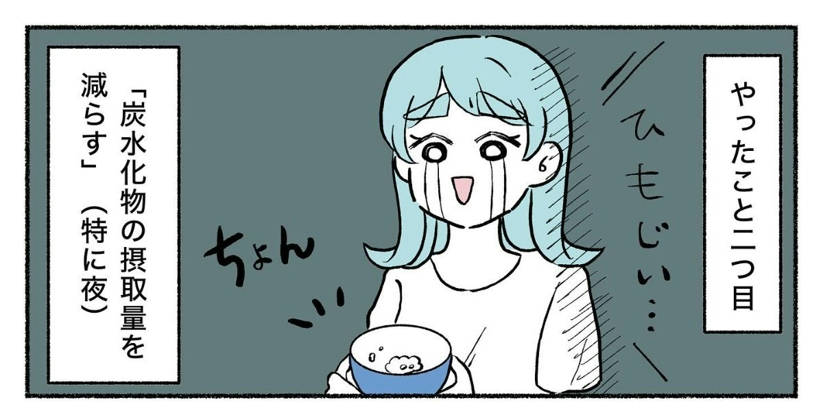 ご飯は一口くらいの量に、麺は糖質オフのものに変えます。物足りなさを感じる夕食に「ひもじい…」と思うりったさんですが、個人的にこの「炭水化物を減らす」が一番効果を感じたそう。