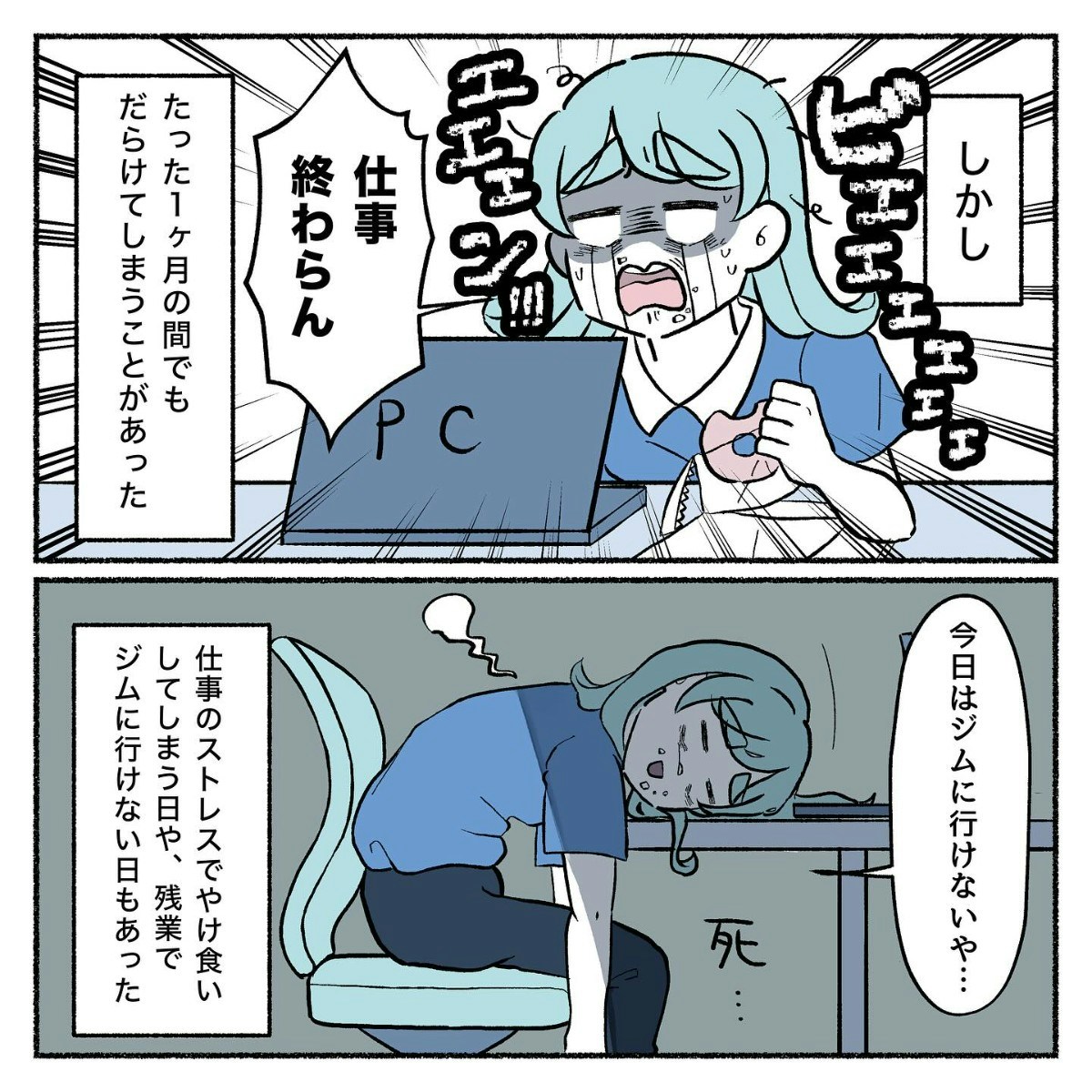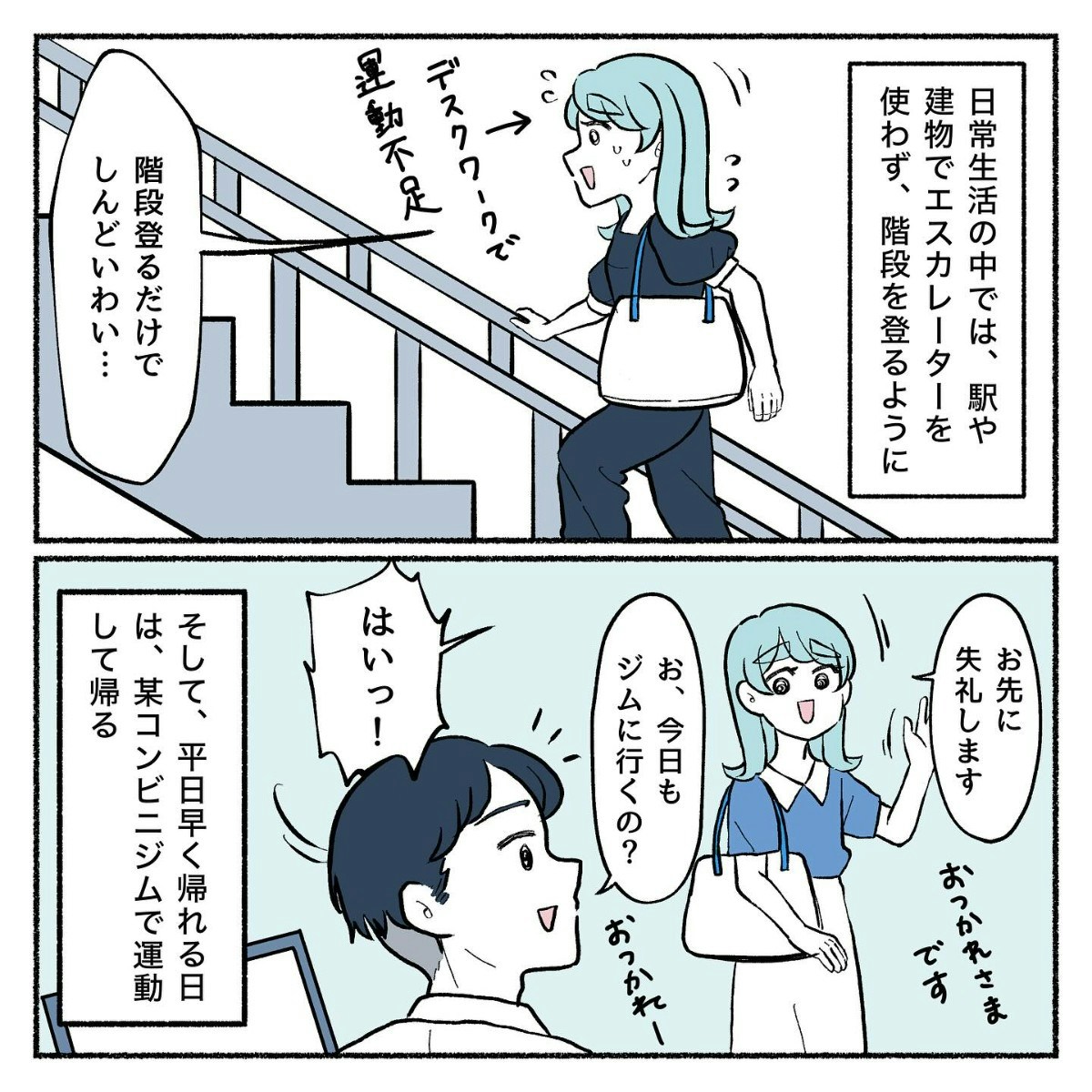 エスカレーターを使わず階段を上るだけでも、デスクワークで運動不足のりったさんはしんどく感じます。そしてさらに、早く帰れる日にはコンビニジムで有酸素運動、足トレ、腹筋などをこなしました。