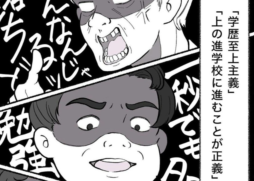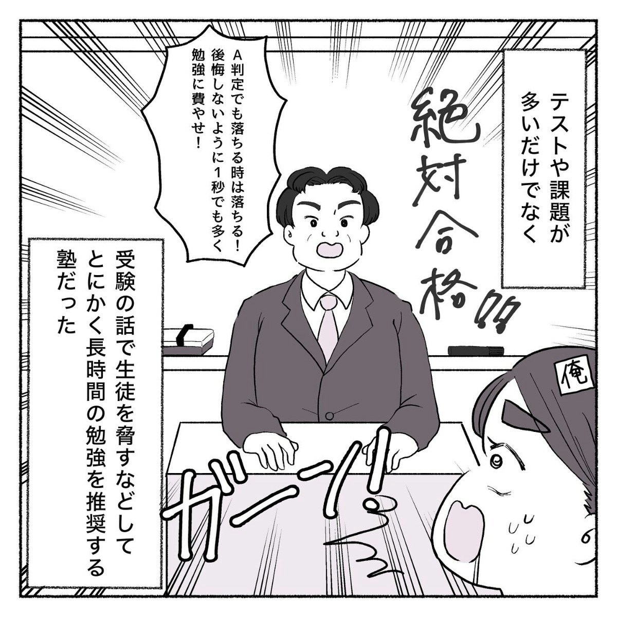 生徒を脅し、長時間の勉強を推奨する学歴至上主義の塾の先生たち。りったさんは「今思えば洗脳」だと振り返ります。